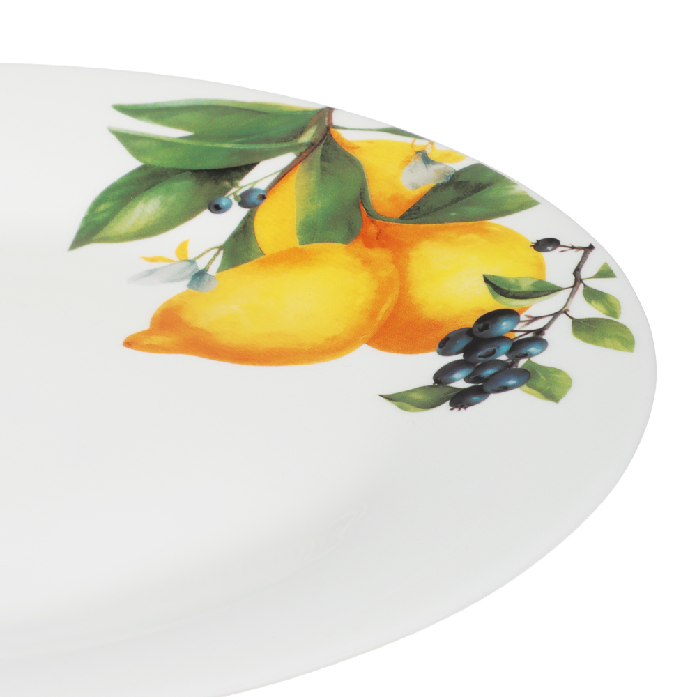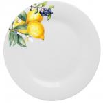 Тарелка подстановочная MILLIMI Лимоны — стильное решение для вашей сервировки. Тарелка диаметром 25 см изготовлена из качественного опалового стекла и украшена сочным рисунком лимонов на белом фоне. Т... Показать описаниеакой дизайн наполнит стол летним настроением и средиземноморским шармом. Тарелка-подставка идеально подходит для создания многоуровневой сервировки: используйте её как основу для десертных тарелок, пиал или даже для подачи закусок и сыров. Яркий рисунок с лимонами эффектно контрастирует с любой однотонной посудой, делая сервировку интересной и завершённой.