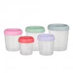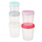 Набор банок для продуктов с завинчивающейся крышкой в количестве 5 штук изготовлен из пластика. Банки для сыпучих продуктов предназначены для хранения муки, круп, соли, сахара, соды, макаронных издели... Показать описанией, орехов, фасоли, кофе и других видов сыпучих продуктов. Крышка плотно закручивается, не пропуская запахи. Прозрачный корпус банки позволяет легко определить содержимое и вовремя пополнить запасы. Легко моются, не занимают много места на полке. Объемы: 1,4 л; 1,05 л; 0,75 л; 0,55 л; 0,4 л.
