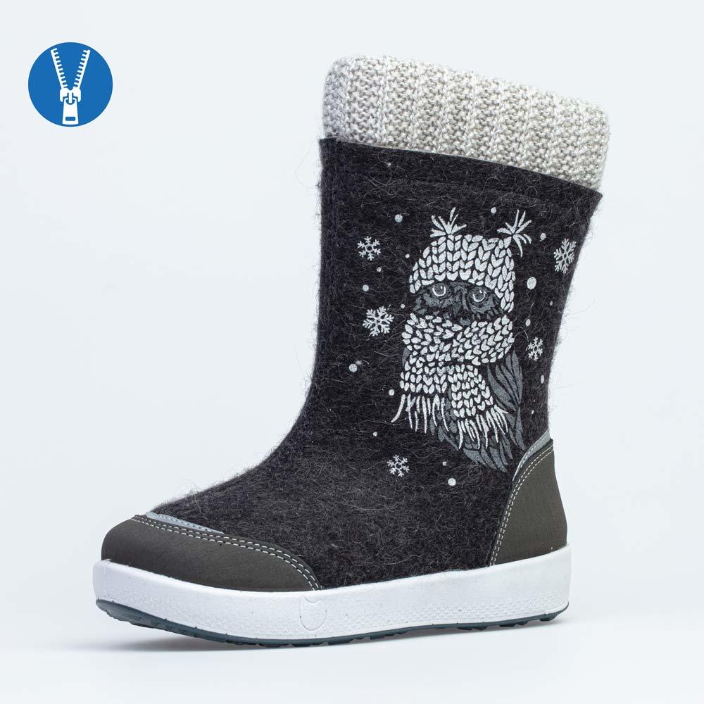 Высокие валенки на молнии выполнены из натурального войлока и подходят для девочки. - Верх из плотного войлока создаёт благоприятный климат вокруг стопы на улице и в помещении. - Подкладка из шерстяно... Показать описаниего меха (натуральная овечья шерсть) отлично сохраняет тепло, придает дополнительный комфорт. - Мягкий манжет из 100% шерсти мериноса обеспечивает комфорт и не позволяет холоду попадать внутрь. - Носок и пятка защищены кожаными накладками с ПУ-покрытием, придающим дополнительную износостойкость и защиту от химических реагентов. - Подошва из ПУ (полиуретана) с накладкой из резины - гибкая, амортизирующая и устойчивая, что особенно важно для зимней обуви.. - Застежка-молния обеспечивает удобное и быстрое одевание обуви.. Рисунок с совой выполнен в технике принта. Поскольку обувь из натуральных материалов, а также с учетом искажения цветопередачи на устройствах, цвет войлока может отличаться. Особое внимание уделено анатомическим свойствам подошвы. Сделано в России.