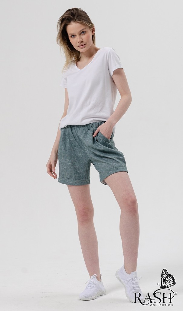 Пижама женская состоит из футболки и бридж. Футболка с круглым вырезом горловины и цельнокроеным рукавом. На полочке фигурная кокетка из отделочного материала отделанная кружевом, на планках с застежк... Показать описаниеой на кнопки. Горловина и низ рукавов окантованы отделочным материалом. Бриджи прямые из набивного полотна, верх на резинке, низ окантован отделочным материалом. Машинная стирка. Состав: 100% Хлопок Цвет: молочный, зеленый