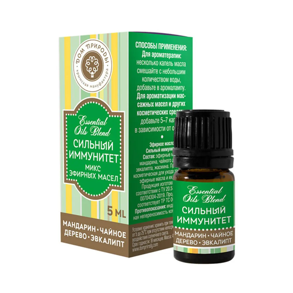 Комплекс эфирных масел "Сильный иммунитет" – профилактика респираторных заболеваний – очищает воздух и препятствует распространению вирусов. Способ применения: Для ароматерапии: несколько капель масла... Показать описание смешайте с небольшим количеством воды, добавьте в аромалампу. Для ароматизации массажных масел и других косметических средств: добавьте 2-5 капель в зависимости от объема. Масса нетто: 5 г.
