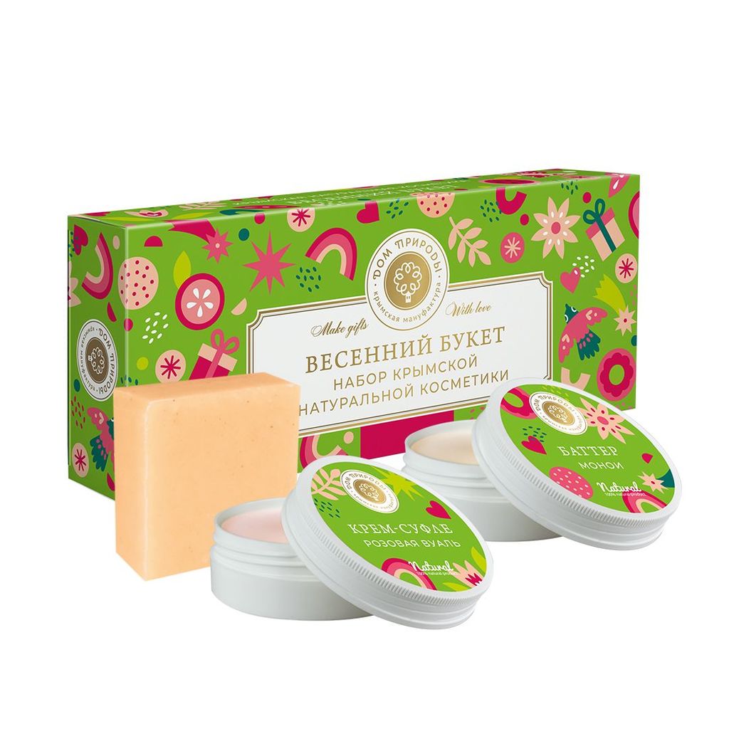 Подарочный набор МИНИАТЮРЫ(мини версии продуктов) Весенний букет: Парфюмированное мыло Белая Фрезия 90г, Крем-суфле для тела Crimean Queen "Розовая вуаль" 50г., Баттер масло монои 50г. ОБНОВЛЕННЫЙ СОСТАВ