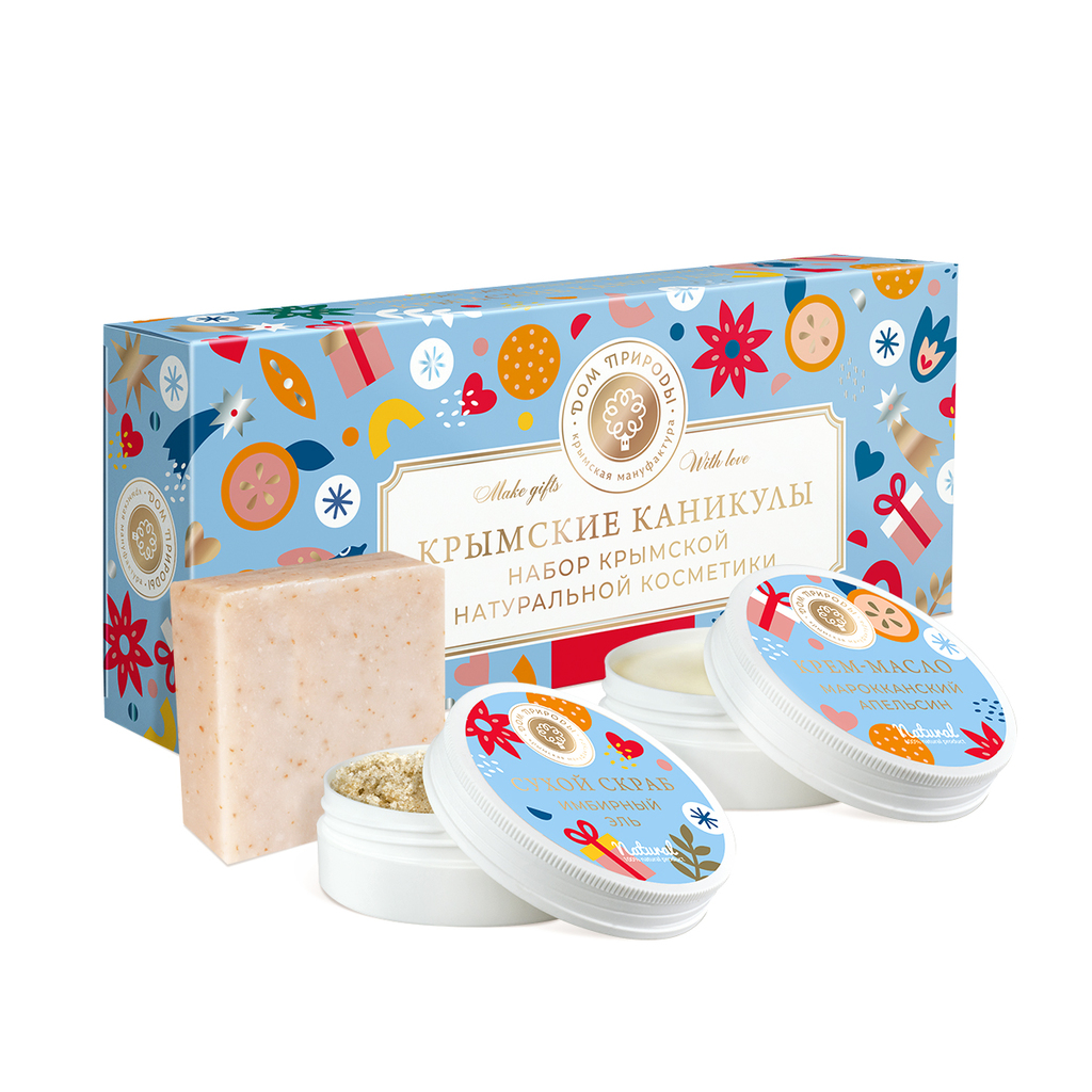 Подарочный набор МИНИАТЮРЫ(мини версии продуктов) Крымские каникулы:Крымское мыло Восточное Сливочная овсянка 90 г, Крем-масло для тела "Марокканский апельсин" 50 г., Сухой скраб Имбирный эль 50 г.