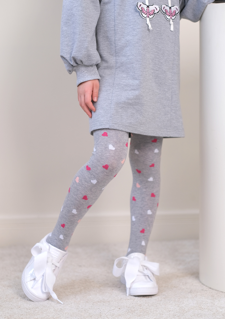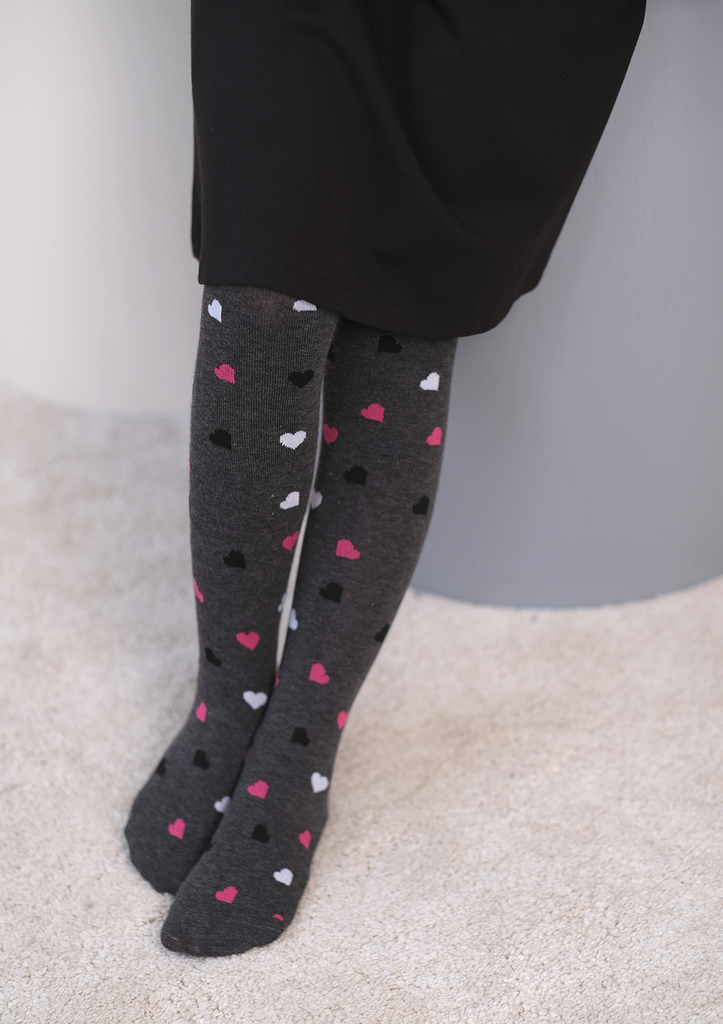 Детские колготки для девочки с рисунком сердечек в сером и темно-сером цвете. Колготки связаны из натурального хлопка (80%), за счет добавления в состав полиамида (15%) и эластана (5%) хорошо тянутся,... Показать описание и, не деформируются. Колготки для девочек комфортны для носки: широкая двойная резинка не давит на живот, и, не позволяет сползать колготкам. Мысок и пятка дополнительно укреплены полиамидной нитью, шов на мыске незаметный и не натирает ножку в обуви. Колготки с рисунком подойдут к школьной форме или для детского сада. Стильные и красивые колготки подходят для повседневной носки и на праздник - они подойдут под любой праздничный костюм. Состав: 80% хлопок, 15% полиамид, 5% эластан