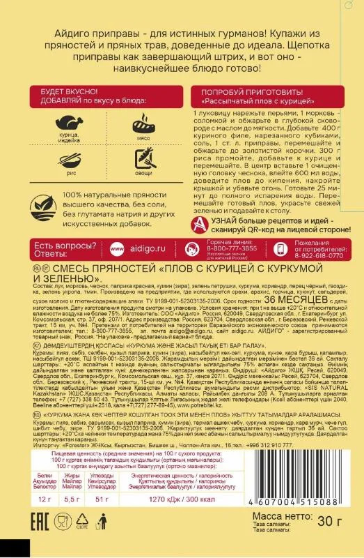 состав * * Укроп * Тмин * Чеснок * Гвоздика * Кумин * Кориандр * Лук * Морковь * Паприка * Петрушка * Куркума * Перец черный Приправа для плова с курицей. В приправе собрано все необходимое для того, ... Показать описаниечтобы ваше блюдо всегда получалось удачным: ароматный чеснок, золотая куркума, пряный кумин, яркие кусочки красной паприки и зелень. Рекомендации по применению: добавляйте приправу во время обжаривания кусочков курицы из расчета 1 ст. л. на 1 кг готового плова. ВЕС: 30 г