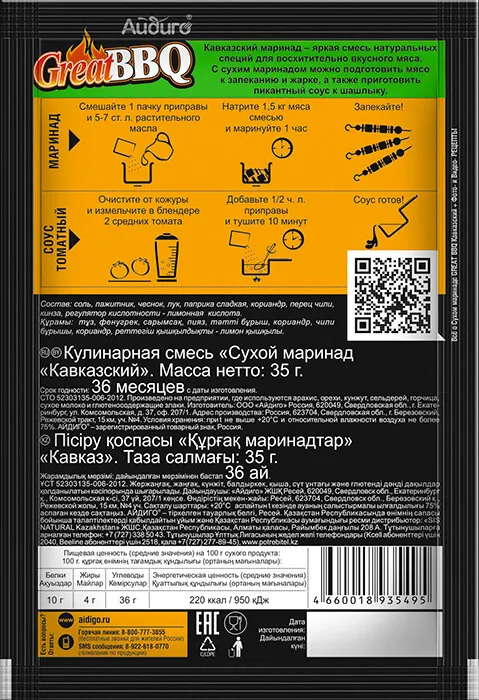 "Кавказский" сухой маринад - яркая смесь натуральных пряностей для вкусного и сочного мяса. С приправой можно подготовить мясо к запеканию и жарке, а также приготовить соус к шашлыку. Одна упаковка ра... Показать описаниессчитана на 1.5 кг мяса. Приготовление: смешайте пачку приправы с 5-7 ст.л. растительного масла. Натрите смесью мясо и маринуйте 1 час. Запекайте на открытом огне или в духовом шкафу. Для приготовления соуса измельчите в блендере 2 средних томата, очищенных от кожуры. Добавьте пол чайной ложки приправы и тушите 10 минут. Соус готов!