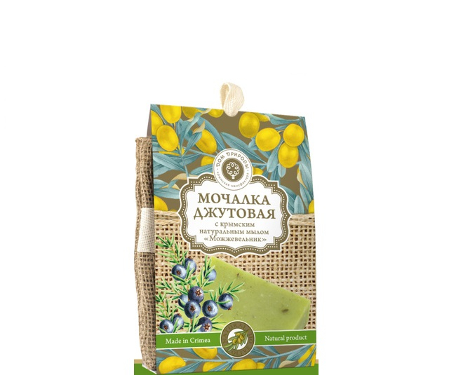 Джутовая мочалка и крымское натуральное мыло с хвойным ароматом эфирных масел и натуральными ягодами можжевельника снимают нервное напряжение и оказывают противовоспалительное действие на проблемную к... Показать описаниеожу. Натуральная мочалка из природных джутовых волокон идеально подходит для ежедневного деликатного очищения кожи благодаря легкому отшелушивающему эффекту. Внутрь каждой мочалки мы поместили цельный брусок натурального мыла ручной работы из серии ТМ «Крымское Мыло Натуральное». Мочалка является великолепным средством для улучшения микроциркуляции крови, очищает кожу от загрязнений и отмерших клеток, подходит для пенного массажа проблемных зон и борьбы с целлюлитом. Джутовые нити изготавливают из волокон тропического растения (лат.название Corchorus). Благодаря своей природной структуре джутовая ткань деликатно массирует кожу, улучшает ее состояние и внешний вид, делает ее мягкой и гладкой. Состав: Мыло Можжевельник: омыленные растительные масла (оливковое, кокосовое, касторовое), вода подготовленная, облепиховое масло, кедровое масло, экстракт хвои, голубая глина, молотые ягоды можжевельника, эфирные масла можжевельника, сосны, сандала экстракт дубового мха. Мочалка джутовая. Способ применения: перед первым применением намочите мочалку теплой водой, вспеньте и тщательно сполосните – мочалка готова к использованию. Чтобы создать обильную пену, намочите мочалку теплой водой и разотрите ее между ладонями. После использования мочалку, не выжимая, подвесьте за шнурок. Когда брусок мыла закончится, вложите в мочалку новый кусочек мыла.