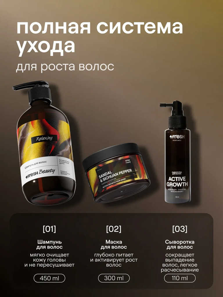 Подарочный набор 4FRESH "Active Growth" создан как продуманная система для ухода, подходящая для тонких, склонных к выпадению и ослабленных прядей. Средства работают комплексно, останавливают выпадени... Показать описаниее, усиливает кровоток, укрепляют корневую систему и стимулирует рост волос. Экстракт розмарина стимулирует микроциркуляцию и питание кожи головы, замедляет превращение тестостерона в ДГТ — основную причину алопеции. Кофеин ускоряет отрастание длины благодаря увеличению клеточной энергии внутри фолликула. Ниацинамид как и никотиновая кислота укрепляют стержень. Селективный нишевый аромат “Сандал и сычуаньский перец” с ярким древесным звучанием и пряным послевкусием. В набор входят три позиции. Шампунь “Активный рост и сохранение длины” обеспечивает деликатное очищение и поддерживает кортекс благодаря растительным церамидам. Маска с высокой концентрацией фосфолипидов, церамидов и маслом кокоса, за счет своей высокой проникающей способности, доставляет полезные жирные кислоты внутрь кортекса, делает волосы более мягкими, послушными и живыми. Сыворотка работает как профессиональный стимулятор и концентрат против облысения. Помогает остановить выпадение, пробуждает спящие луковицы и заметно увеличивает густоту. Формулы не содержат силиконов, поэтому ухаживают честно и эффективно. Такой формат набора идеально подойдет тем, кто выбирает качественный уход для красоты и здоровья волос. Комплект станет универсальным подарком для женщин и даже для мужчин, которые выбирают заботу о волосах и атмосферный аромат на каждый день.