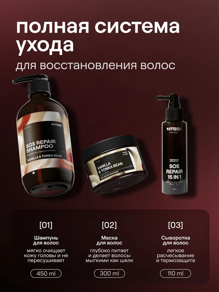 Подарочный набор 4FRESH “SOS Repair” создан как продуманная система для ухода, подходящая для сухих, ослабленных и окрашенных прядей. Средства работают комплексно, возвращают гладкость, мягкость и кон... Показать описаниетроль, а также формируют стойкий эффект восстановления. Аромат сочетает в себе ноты карамельного яблока, сливочной ванили, жасмина, сандала и бобов тонка, создавая расслабляющее настроение. В набор входят три позиции. Шампунь “Экстрапитание и восстановление” обеспечивает деликатное очищение и поддерживает кортекс благодаря растительным церамидам. Маска с кератином даёт быстрый выразительный результат: укрепляет структуру и усиливает блеск по всей длине. Сыворотка улучшает расчёсывание, уменьшает пушистость и сохраняет лёгкость без утяжеления. Формулы не содержат силиконов, поэтому ухаживают честно и эффективно. Такой формат набора идеально подойдет тем, кто выбирает качественный уход для красоты и здоровья волос.
