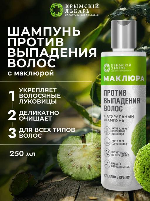 Бальзам-маска с экстрактом маклюры восстанавливает ослабленные волосы, предотвращает их выпадение, восполняет потерю влаги. Кокосовое масло и витамин B6 питают, стимулируют рост волос. Кератин и инули... Показать описаниен улучшают структуру волоса, придают шелковистость и блеск. Средства для волос с целебной маклюрой укрепляют волосы, ускоряют их рост, предотвращают выпадение. Используйте шампунь и бальзам-маску с маклюрой от “Крымского лекаря”, чтобы ваши волосы были сильными, гладкими и блестящими. Способ применения: средство наносят на чистые влажные волосы: 1. В качестве бальзама: подержать 1-2 минуты, смыть водой. Подходит для частого применения. 2. В качестве маски: подержать 15-20 минут, смыть водой. Используйте несколько раз в неделю. Состав: вода подготовленная, цетеариловый спирт, дистеарилдимониум хлорид, глицерилмоностеарат, кокосовое масло, экстракты шалфея, маклюры, инулин, глицерин, кокоглюкозид, кислота лимонная, Д-пантенол, каприк/каприлик триглицерид, кератин, пиридоксин (витамин В6), пектин цитрусовый, аллантоин, бензиловый спирт, бензойная кислота, сорбиновая кислота, дегидроуксусная кислота, аромакомпозиция.