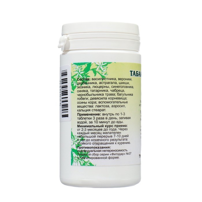 При непреодолимой тяге к курению или парению. Устраняют физиологическую и психологическую зависимость к табакокурению. При регулярном применении уменьшают или полностью ликвидируют тягу к никотину. Эф... Показать описаниефективно улучшают мозговое кровообращение, что приводит к нормализации нервной системы, очищают сосуды и легкие, оказывают антисептическое и отхаркивающее действие. Состав: адониса, василистника, вероники, дербенника, зюзника, люцерны, овса, посконника, синеголовника, чабреца, чернобыльника трава; девясила корневища; осины кора. Применение: по 1 -3 таблетки 3 раза в день за 10 минут до еды, растворив в 100 мл теплой некипяченой воды либо проглотить не разжевывая, запив водой. Минимальный курс приема: от 2-3 месяцев до года. Через каждый месяц желателен небольшой перерыв 7-10 дней и так до конечного результата: стойкого отвращения к курению.
