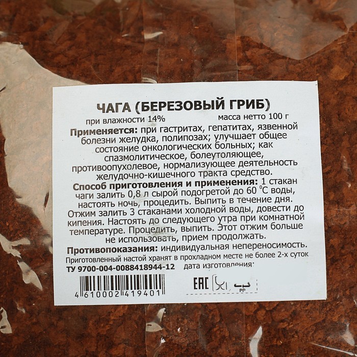 при гастритах, гепатитах, язвенной болезни желудка, полипозах; улучшает общее состояние онкологических больных; как спазмолитическое, болеутоляющее, противоопухолевое, нормализующее деятельность желуд... Показать описаниеочно-кишечного тракта средство. Способ приготовления и применения: 1 стакан чаги залить 4 стаканами кипяченной 60 С воды, настоять ночь, процедить. Выпить в течение дня. Отжим залить 3 стаканами холодной воды, довести до кипения. Настоять до следующего утра при комнатной температуре. Процедить, выпить. Этот отжим больше не использовать, прием продолжать. Противопоказания: индивидуальная непереносимость.