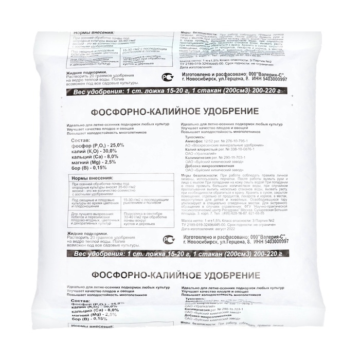 ~ Увеличивает урожайность всех культур. ~ Повышает сопротивляемость растений к заболеваниям. ~ Улучшает вкус и качество урожая. ~ Увеличивает длительность хранения урожая. Состав: Калий > 25,4% Маг... Показать описаниений > 0,87% Срок годности: 5 лет Условия хранения (температура): от -30 до +30 Рекомендации по применению: При внесении удобрения рекомендуется использование типовых технических средств, предназначенных для выполнения агрохимических работ или ручного инвентаря. При основном внесении удобрение ранвомерно рассыпают по поверхности почвы и проводят вспашку или перекопку или рыхление. При посеве и посадке овощных культур удобрение вносят в рядки или лунки и перемешивают с почвой. При подкормках удобрение равномерно распределяют между рядами растений (в междурьядьях) или вокруг растений не ближе 8-10 см от стебля, или по поверхности почвы, с последующей заделкой удобрения в почву рыхлением. После подкормки растения рекомендуется обильно полить.