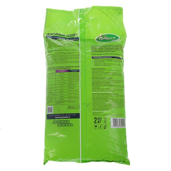 Органическое удобрение рекомендуется для естественного восстановления и повышения плодородия почвы, обеспечения сбалансированного питания и формирования мощной корневой системы, приживаемости рассады,... Показать описание ускорения сроков созревания урожая. Произведен по современным технологиям, которые обеспечивают важные преимущества перед обычным компостом - удобрение не имеет резкого запаха. В процессе биотехнической обработки куриного помета Добрая Сила уничтожаются патогенные болезни (сальмонелла, грибковые заболевания, вплоть до куриного гриппа), яйца гельминтов, личинки насекомых-вредителей, семена сорных растений. При длительном хранении удобрение не меняет своих свойств. Подходит для овощных, плодово-ягодных и декоративных культур. Эффективно применение на кислых и загрязненных тяжелыми металлами почвах. Хорошо для приготовления почвосмесей, для выращивания рассады, укоренения черенков, заполнения теплиц и парников. Идеально сочетается со всеми продуктами марки для обеспечения жизнедеятельности растений.