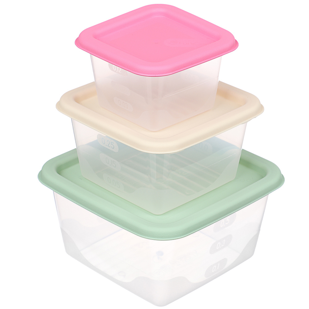 Практичный набор из трех герметичных контейнеров разного объема: 0,63 л, 0,33 л и 0,15 л. Изготовлен из качественного пищевого пластика, подходит для хранения сыпучих продуктов, готовых блюд, соусов, ... Показать описаниезакусок и полуфабрикатов. Компактные квадратные контейнеры легко складываются друг в друга, экономя место на кухне или в сумке. Герметичные крышки защищают продукты от протекания и посторонних запахов. Удобно брать в дорогу или на работу! Рекомендации При чистке моющими средствами для посуды использовать только губки или мягкие ткани. Хранить в сухом месте.