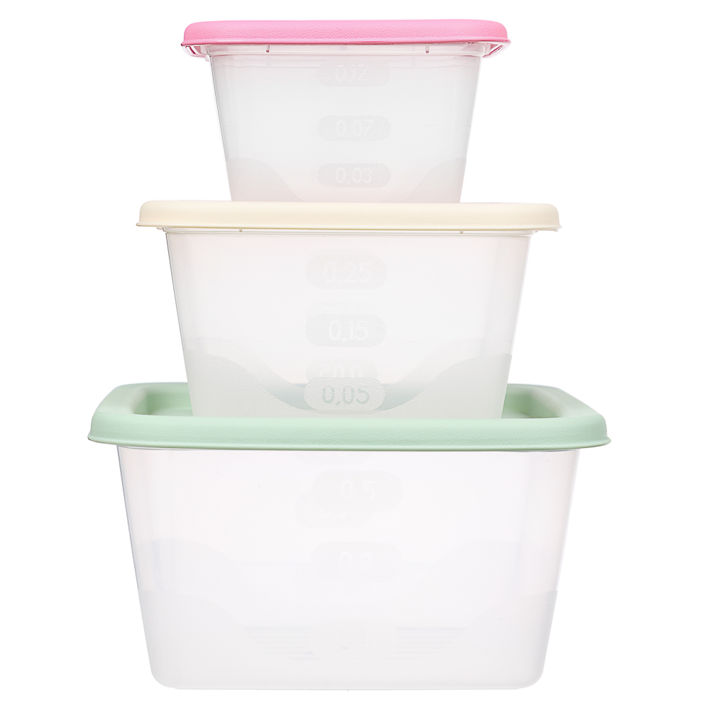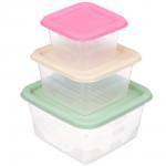 Набор из трех квадратных контейнеров по 0,33 л – универсальное решение для хранения и разогрева продуктов. Выполнен из прочного пищевого пластика. Идеально подходит для хранения сыпучих продуктов, гот... Показать описаниеовых блюд, соусов и полуфабрикатов в холодильнике или морозильной камере. Герметичные крышки надежно защищают от протекания и сохраняют свежесть продуктов. Можно использовать для заморозки (до -20°C) и разогрева в СВЧ (до +70°C). Компактные квадратные формы экономят место в холодильнике и на полках. Безопасный пластик не впитывает запахи, легко моется. Рекомендации При чистке моющими средствами для посуды использовать только губки или мягкие ткани. Хранить в сухом месте.