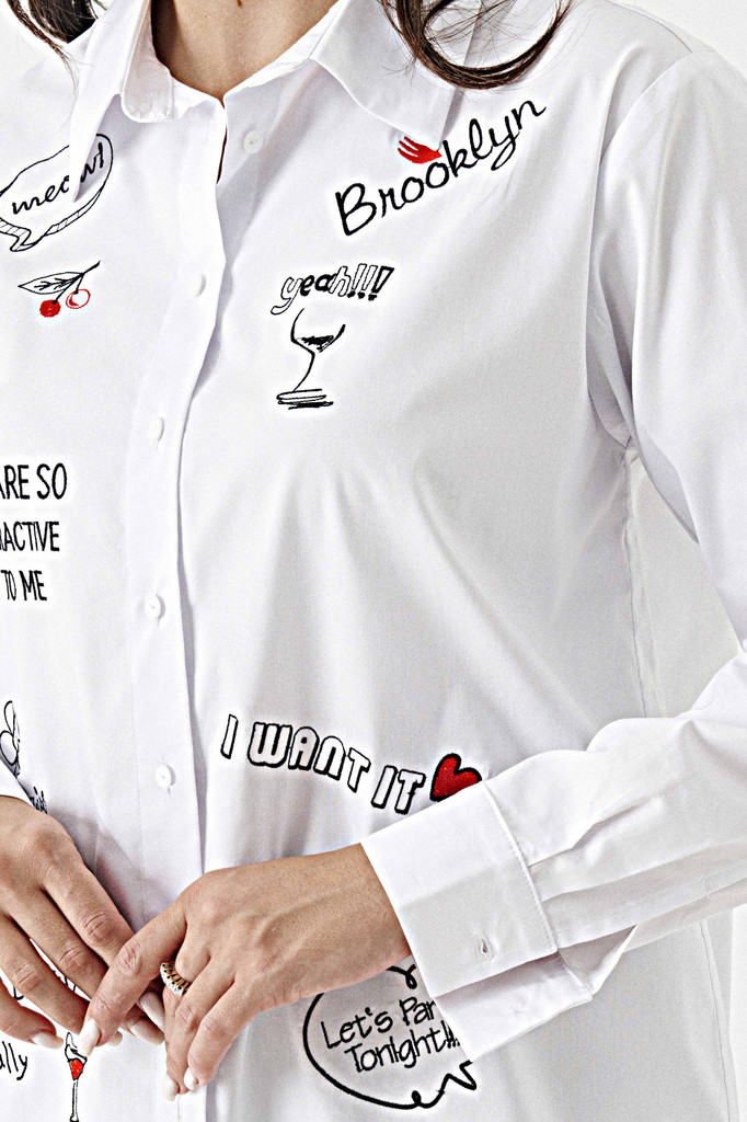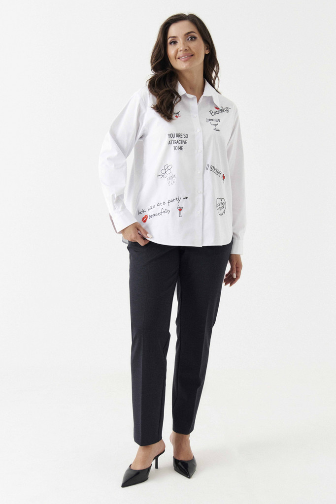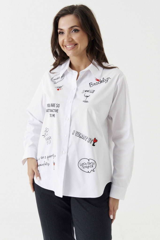 Описание Блузка женская из смесовой ткани для повседневной носки прямого силуэта. Перед имеет вышивку и закругленную линию низа. Застежка на восемь обметанных петель и восемь пуговиц. Спинка имеет кок... Показать описаниеетку и две складки, а также закругленную линию низа. Горловина обработана рубашечным воротником с отрезной стойкой. Низ рукава обработан притачной манжетой с застежкой на одну обметанную петлю и одну пуговицу. Такой креативный вариант блузки обязательно привлечет к вам внимание. Блузка станет вашей любимой вещью в гардеробе. Параметры Рост: 164 50 Блузка: Длина изделия - 67.5см, Длина рукава - 60см, Ширина плеча - 15см, Ширина по груди - 58см, Ширина по низу - 61.5см, Ширина рукава - 23см; 52 Блузка: Длина изделия - 67.5см, Длина рукава - 60см, Ширина плеча - 15.2см, Ширина по груди - 58см, Ширина по низу - 63.5см, Ширина рукава - 23.8см; 54 Блузка: Длина изделия - 68.5см, Длина рукава - 60см, Ширина плеча - 15.4см, Ширина по груди - 58см, Ширина по низу - 65.5см, Ширина рукава - 24.6см; 56 Блузка: Длина изделия - 68.5см, Длина рукава - 60см, Ширина плеча - 15.6см, Ширина по груди - 58см, Ширина по низу - 67.5см, Ширина рукава - 25.4см; 58 Блузка: Длина изделия - 68.5см, Длина рукава - 60см, Ширина плеча - 15.8см, Ширина по груди - 58см, Ширина по низу - 69.5см, Ширина рукава - 26.2см; Состав и уход Состав: Хлопок/cotton 76%; полиэстер/polyester 22%; эластан /elastane 2%. Уход: * Стирка при температуре воды до 30°C * Не отбеливать * Гладить при температуре утюга до 110°C * Вертикальная сушка * Барабанная сушка запрещена * Профессиональная сухая чистка в тетрахлорэтилене и во всех растворителях, внесенных в список для символа F.