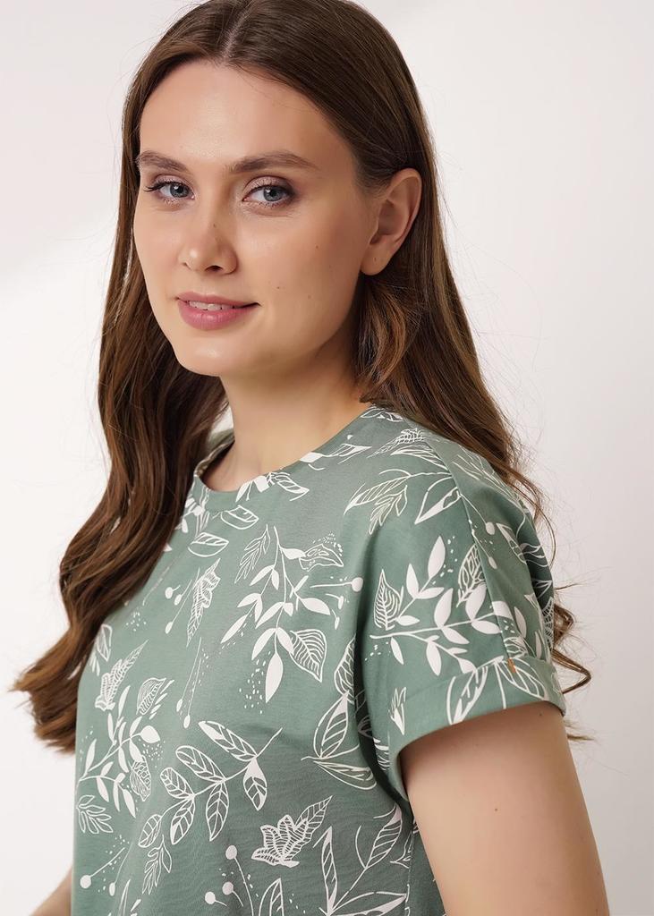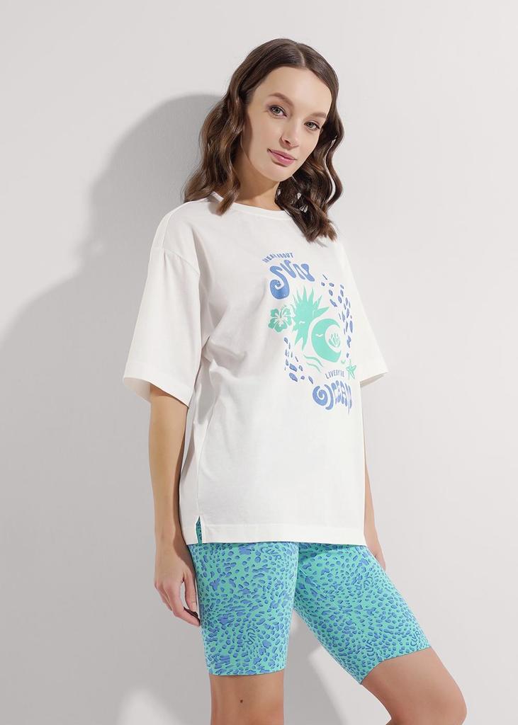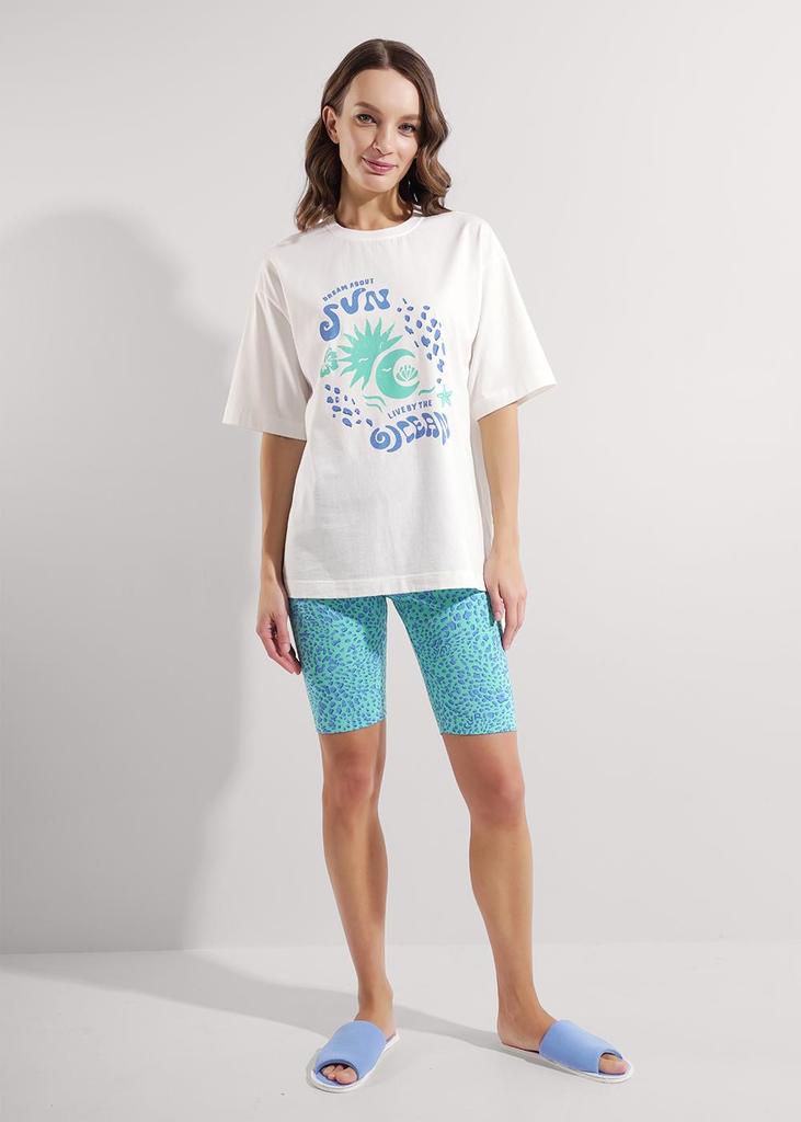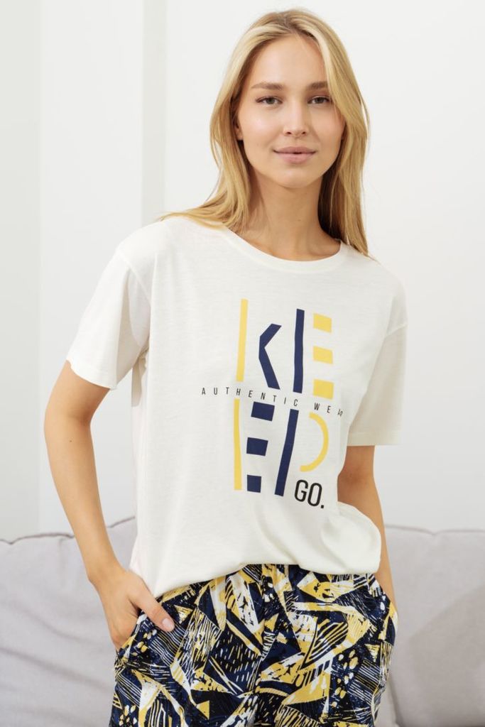 Футболка выполнена из кулира - легкого хлопкового полотна с лайкрой. Изделие прямого покроя со спущенным плечом, рукавами длиной 1/2 и круглым вырезом горловины, украшено печатью. По низу изделия и ру... Показать описаниекавов широкая подгибка. Уход: только машинная стирка (руками не стирать!) при температуре 40 градусов, без предварительного замачивания. Состав: кулир с лайкрой / хлопок 92% + лайкра 8%.