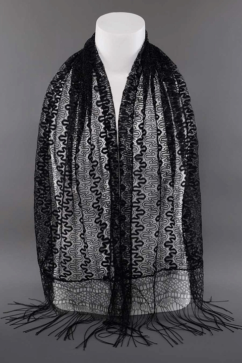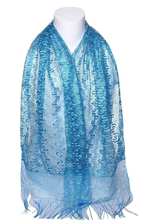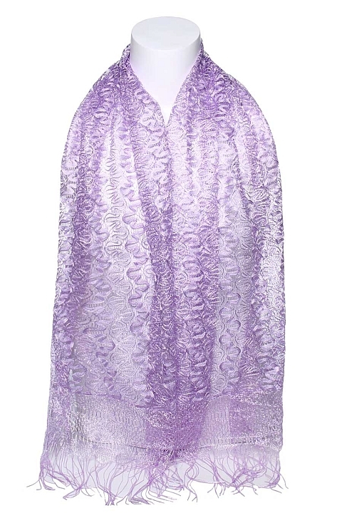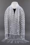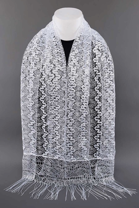 Шарф выполнен из мягкой кружевной ткани. Края шарфа- оверлочный шов, концы - бахрома. Размер: 45 х 130 см. ( +/- 3 см.) Состав: 100% полиэстер. Производство Китай.