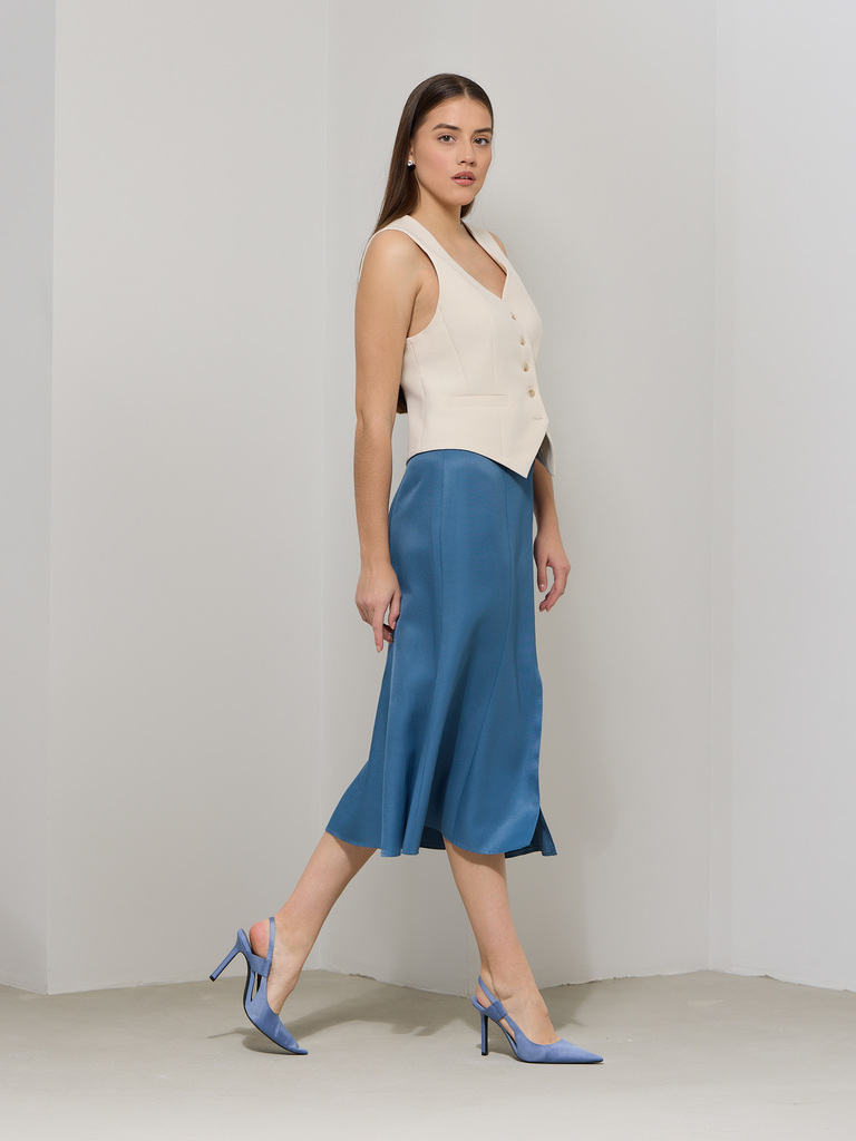 Юбка миди, А-образный крой, разрез спереди, из благородной фактурной вискозной ткани с эффектом "флеш". Подробное описание: https://falinda-opt.ru/catalog/detail/yubka_1_385_2042_2/
