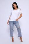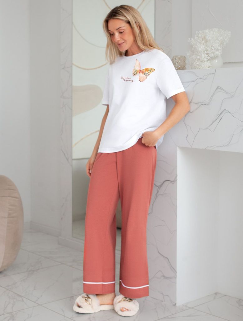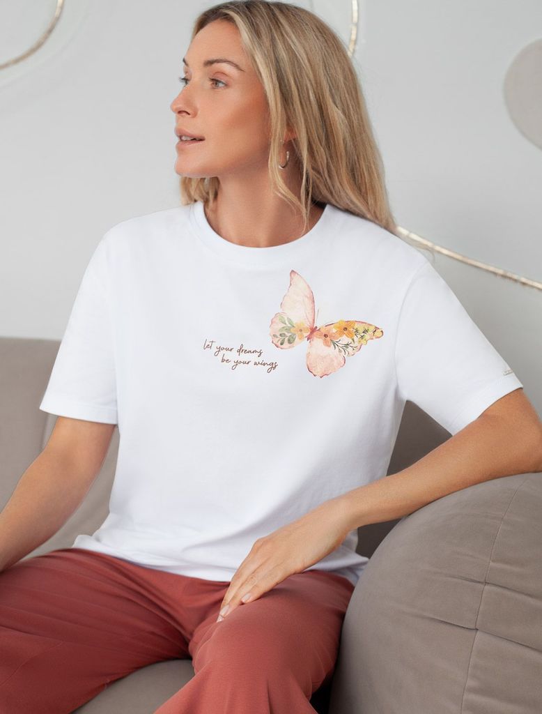 Состав: 92%Хлопок 8%ПУ Плотность: 170 Г/м2 Размер товара на первом фото: 42 Футболка белого цвета изготовлена из премиального хлопка с эластаном, она обеспечивает невероятное ощущение уюта и легкости.... Показать описание Натуральный материал сохраняет форму и цвет после множества стирок, обеспечивая долговечность изделия, а его высокая воздухопроницаемость создает ощущение свежести даже в течение долгого дня. Особое внимание привлекает стильный принт в виде бабочки с минималистичной надписью. Перевод надписи Let your dreams be your wings - Пусть твои мечты станут твоими крыльями. Принт выполнен красками с устойчивым покрытием, который добавляет изделию оригинальности и позволяет выразить индивидуальность. Свободный крой футболки дарит удобство и не стесняет движений, что делает ее идеальной для повседневной носки или активного отдыха, подчеркивает современный взгляд на моду. На рукаве металлический логотип бренда. Подойдет девушкам и женщинам на любую фигуру, вы будете чувствовать себя в ней уверенно и комфортно. Отлично впишется в гардероб благодаря универсальному дизайну, который легко сочетать с джинсами, шортами или спортивными брюками.