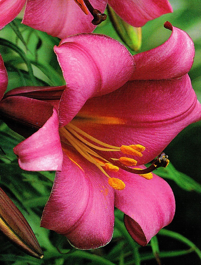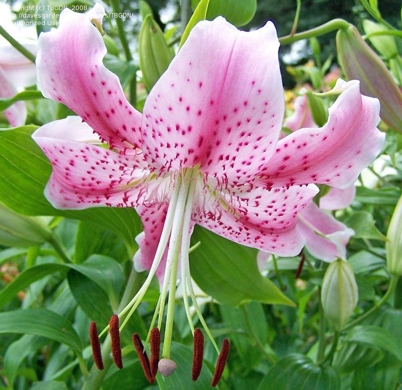 НОВИНКА Сорт невероятной красоты! Окрас цветка - насыщенный розовый с белой размытой окантовкой. Вдоль центральной части лепестков проходит яркая пурпурная полоска, которая украшена тёмно-бордовым кра... Показать описаниепом. Тычинки белые, с коричневыми пыльниками. Высота растения - 120-140 см, диаметр цветка - 12-14 см.