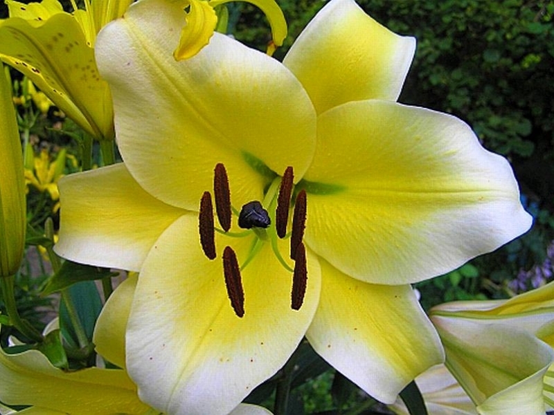 Цветки крупные, диаметром 27 см, светло-желтого цвета с кремово-белыми краями. Высота растения - 90-105 см.