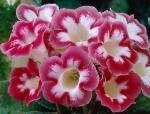 Цветки крупные, диаметром 22 см, бело-розовые, края насыщенно-розовые, внешняя сторона цветка ярко-розовая, с внутренней и внешней стороны лепестка красные полосы.
