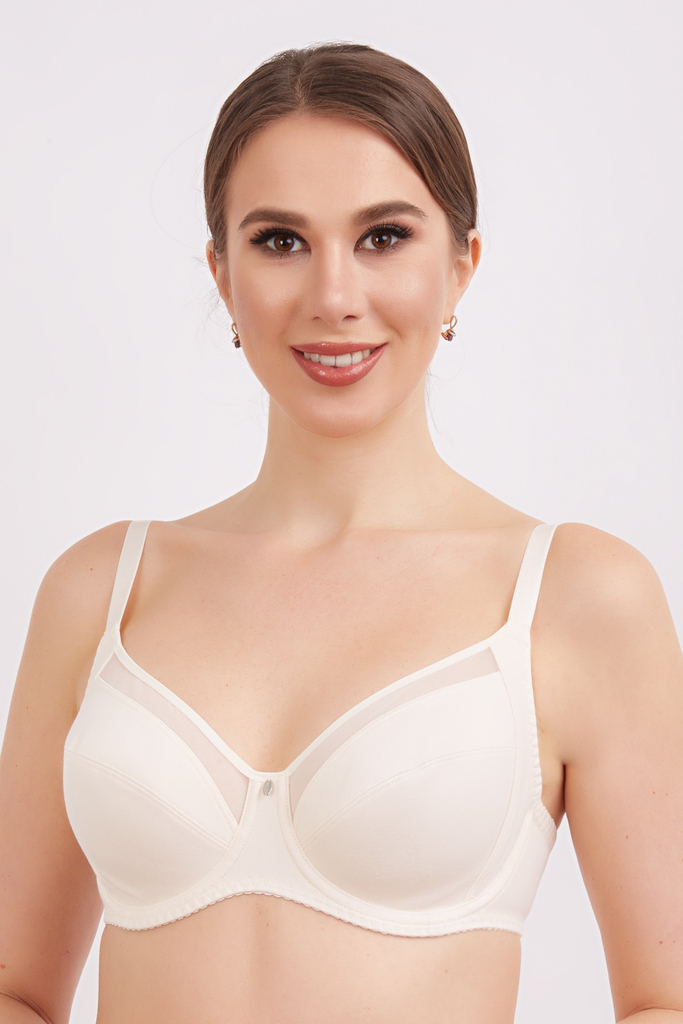 Бюстгальтер из трикотажного хлопкового полотна, трикотажного полотна и эластичного сетчатого полотна. Мягкие чашки на каркасе с боковой корректирующей деталью. Бюстгальтеры с боковой корректирующей де... Показать описаниеталью хорошо формируют грудь, собирая ее с боков. Нижняя часть чашки ламинирована хлопковым полотном, что обеспечивает лучшую поддержку для больших полнот и комфорт в носке. В верхней детали чашки вставка из эластичного сетчатого полотна. Используется четырехрядная застежка, что позволяет идеально отрегулировать объем бюстгальтера. Ширина бретелей и застежки изменяется в зависимости от размера бюстгальтера.