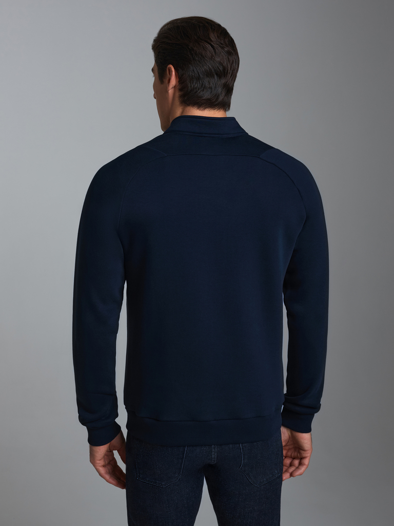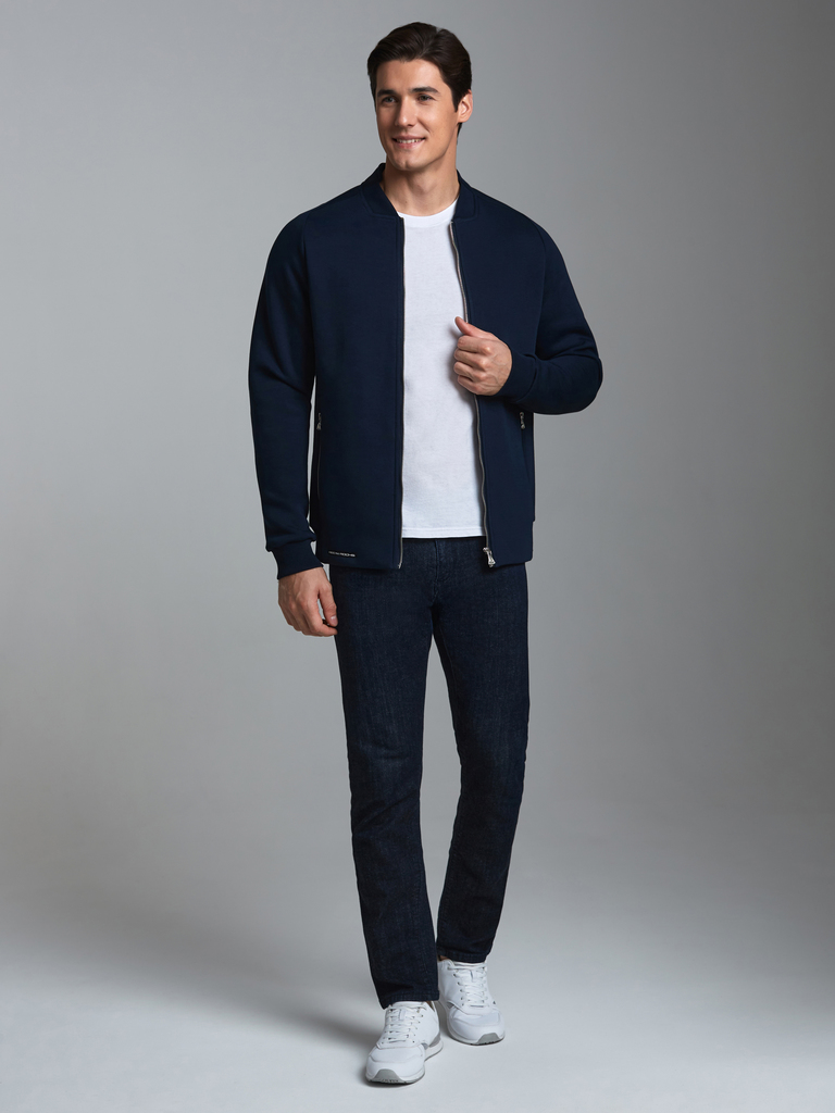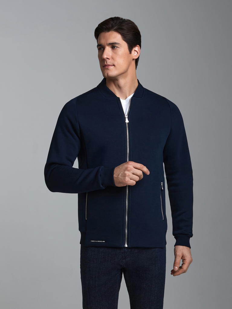 Толстовка изготовлена из плотного хлопкового трикотажного полотна с изнаночным начесом. Изделие на поясе, с воротником-стойкой, застегивается на молнию. Рукава комбинированного анатомического покроя. ... Показать описаниеЧитать далее Вставки воротника, пояс и манжеты куртки изготовлены из плотной эластичной трикотажной резинки. Карманы прорезные, с молниями.