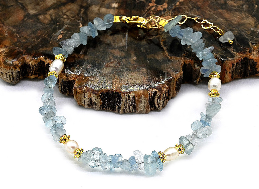 Материал: Аквамарин Натуральность: Натуральный камень Месторождение: Бразилия Основание: Камень •Браслет с крошкой аметрина со вставками натуральных жемчужин на стальном тросике - это стильное и элега... Показать описаниентное украшение. •Аквамарин считается покровителем всех людей, связанных с морем, помогает справиться с боязнью воды. Так же он помогает поддерживать мир в отношениях и способствует восстановлению дружеских и романтических связей, улучшая взаимопонимание и доверие. •Жемчуг придаёт украшению нежность и классический шарм. •Такой браслет хорошо сочетается с повседневными образами (джинсы, белая рубашка, лёгкие свитер), офисным стилем и романтичными нарядами (платья, шифоновые блузы). •Длина браслета 18см + 5см цепочка-удлинитель.