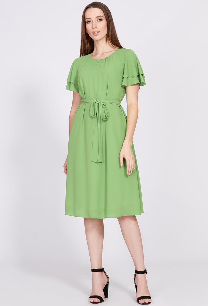 Воздушное платье расклешённого кроя с округлой формой горловины выполнили из ткани с цветочным принтом. Максимально женственной модель делают струящийся силуэт, сборка по горловине переда и двойные ру... Показать описаниекава-бабочки. Нижний слой платья выполнен из мягкой приятной к телу ткани. Чтобы сделать платье еще более эффектным, линию талии подчеркнули поясом из основной ткани. Длина платья в 46р - 104см, длина рукава от горловины - 32см. Длина платья в 50р - 106см, длина рукава от горловины - 33см.