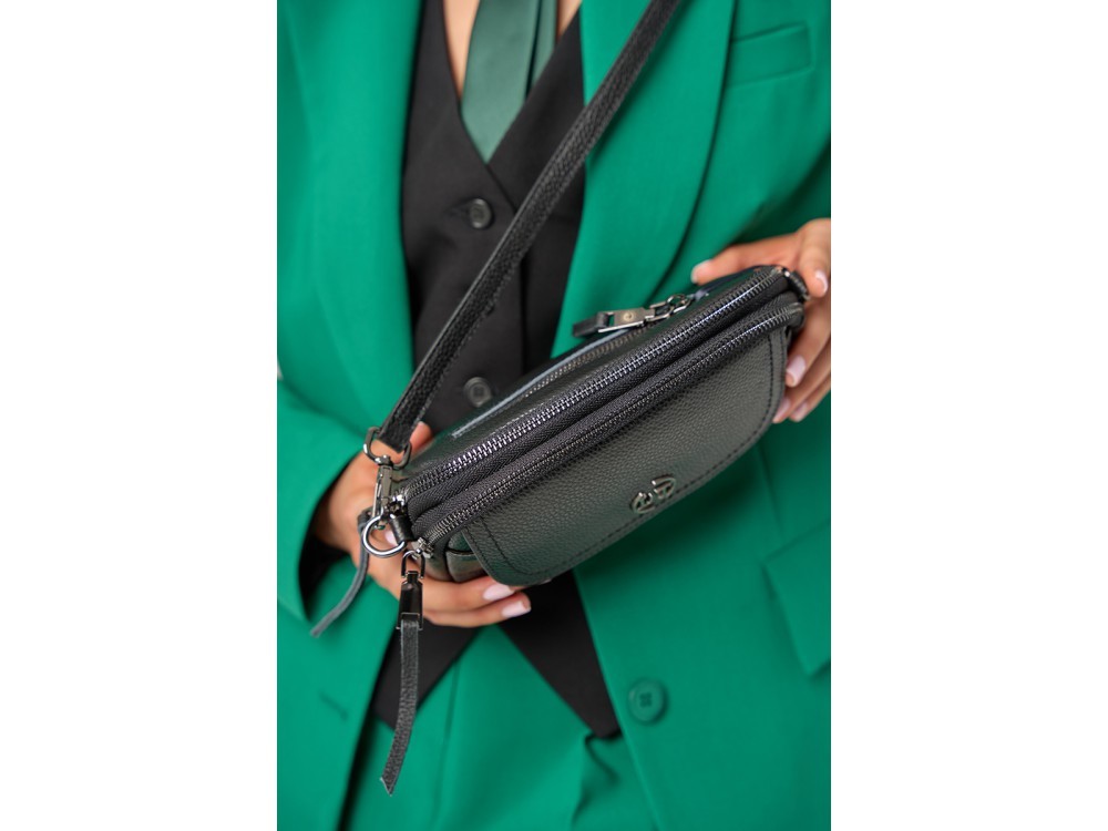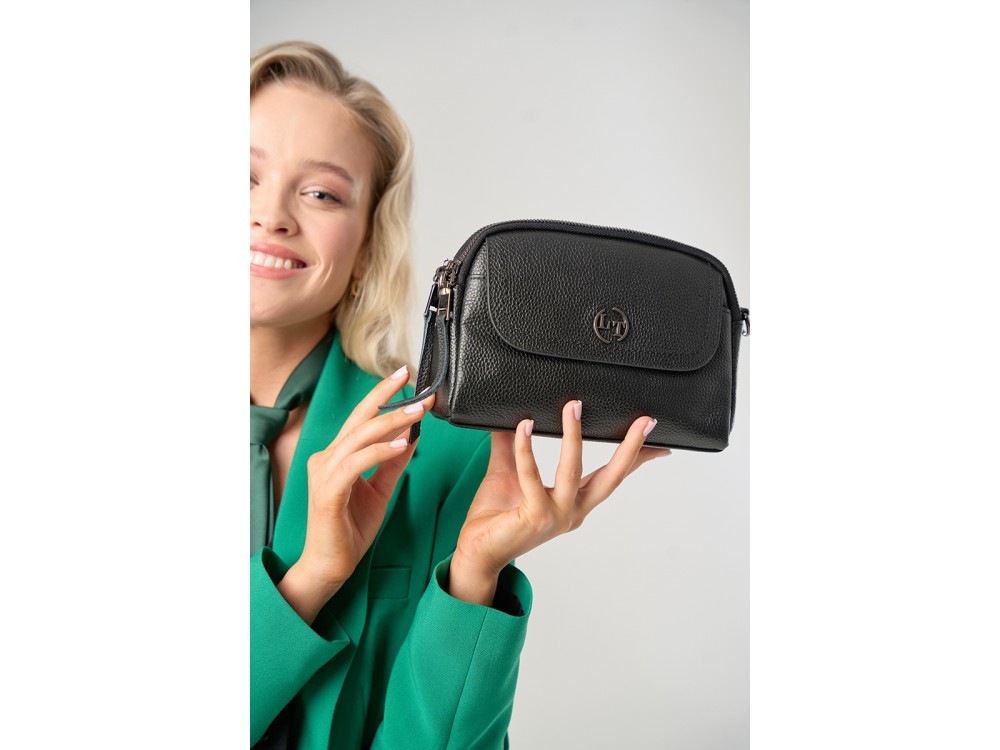 Распродажа! Размер: 18.5/9.5/20.5 Вес товара без упаковки: 0,4 Состав: натуральная кожа Вид застежки: молния Описание: Длинный ремень с возможностью регулировки. Внутри: два отделения, между ним... Показать описаниеи перегородка в виде кармана на молнии. Дополнительно два кармана для аксессуаров, один из которых застегивается на молнию. Снаружи: сзади карман для мелочей на молнии. Подходит как под классический так и под спортивный стиль.