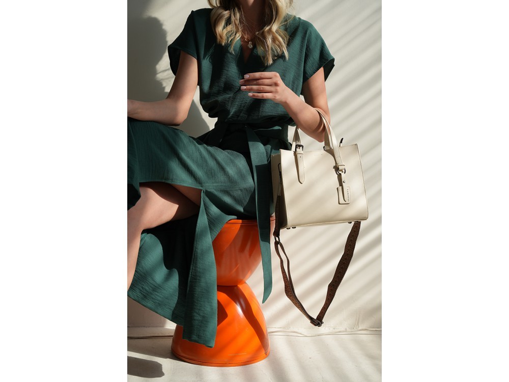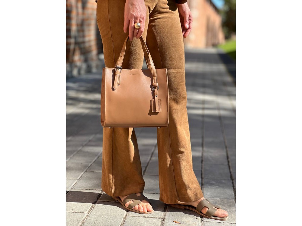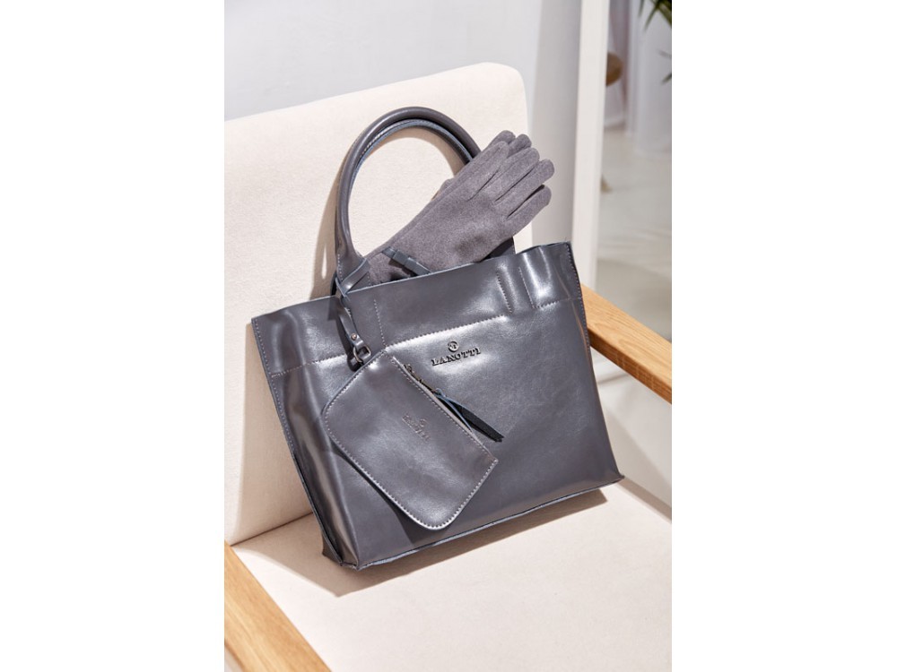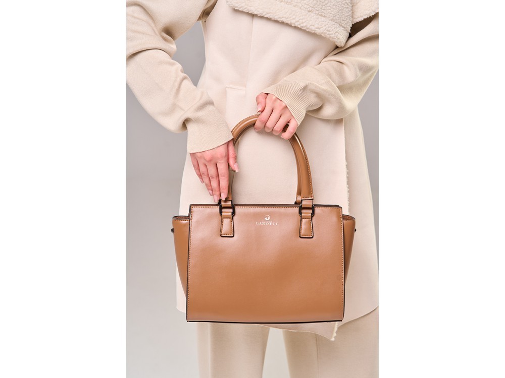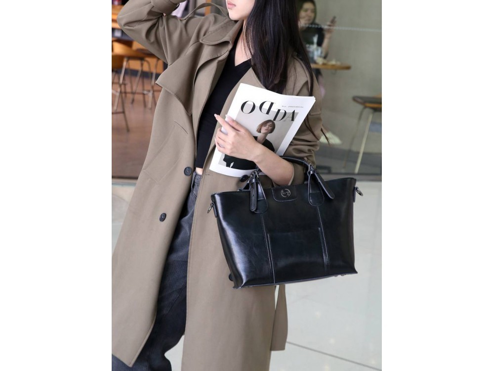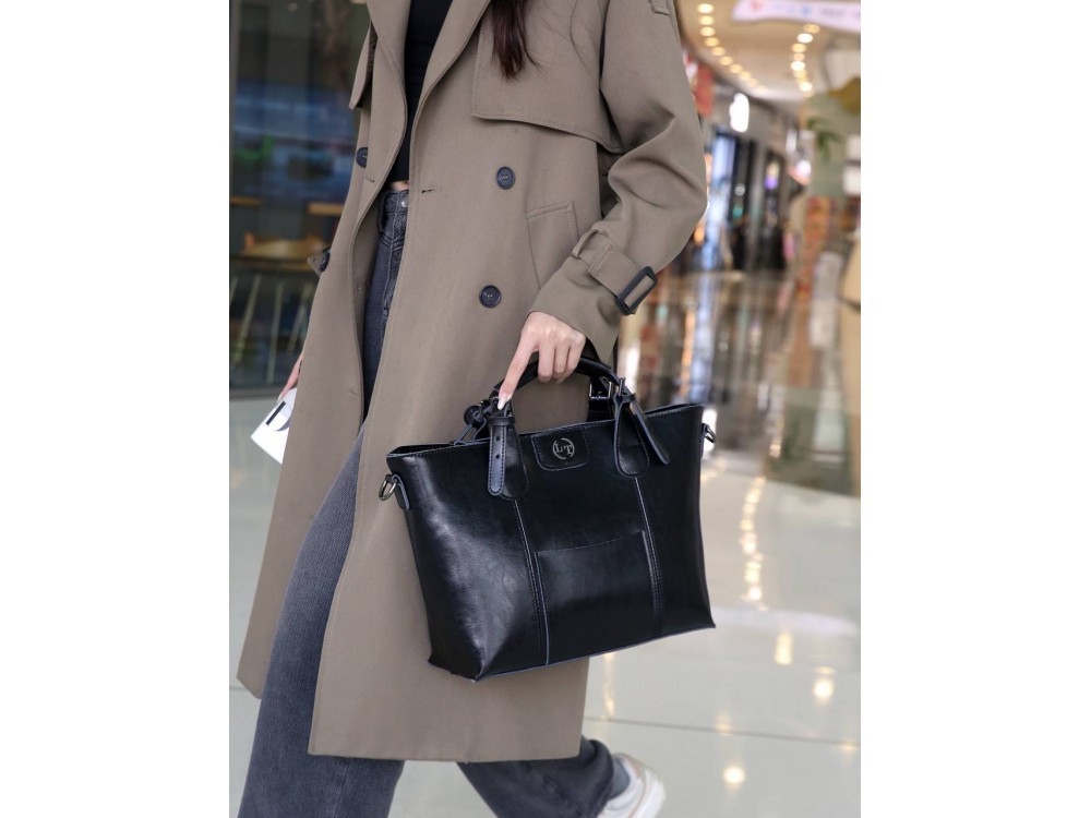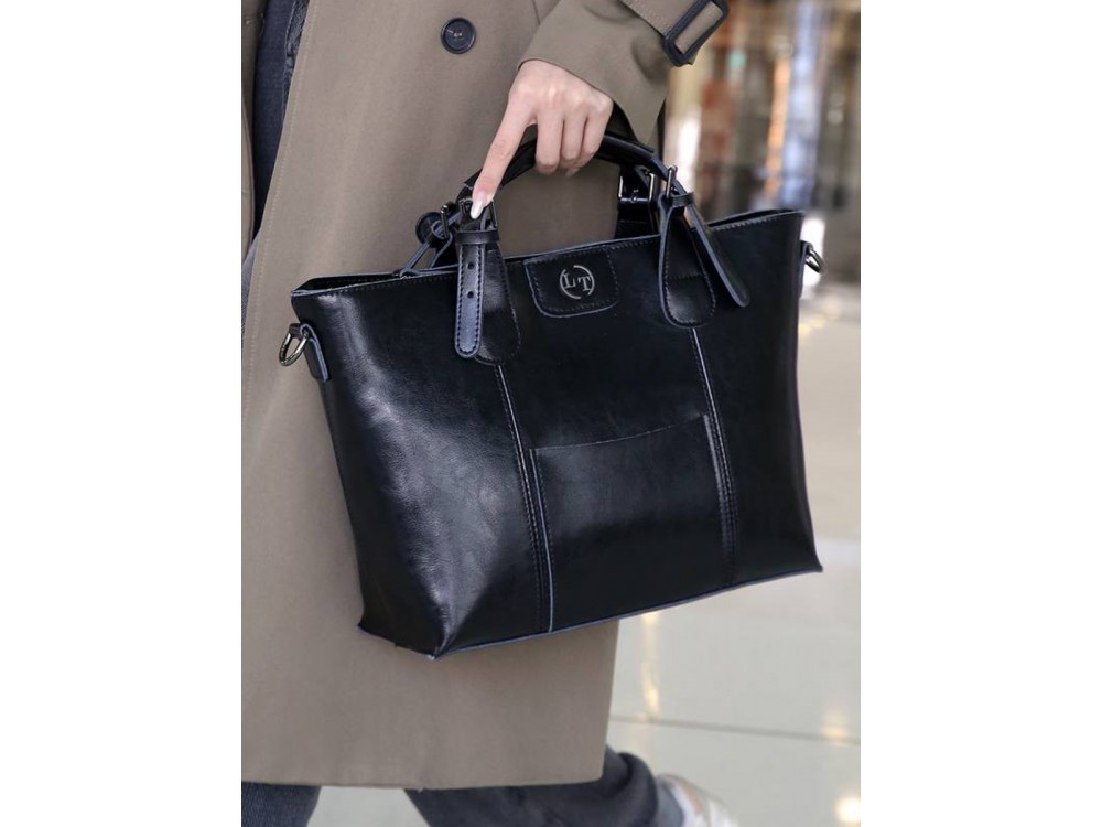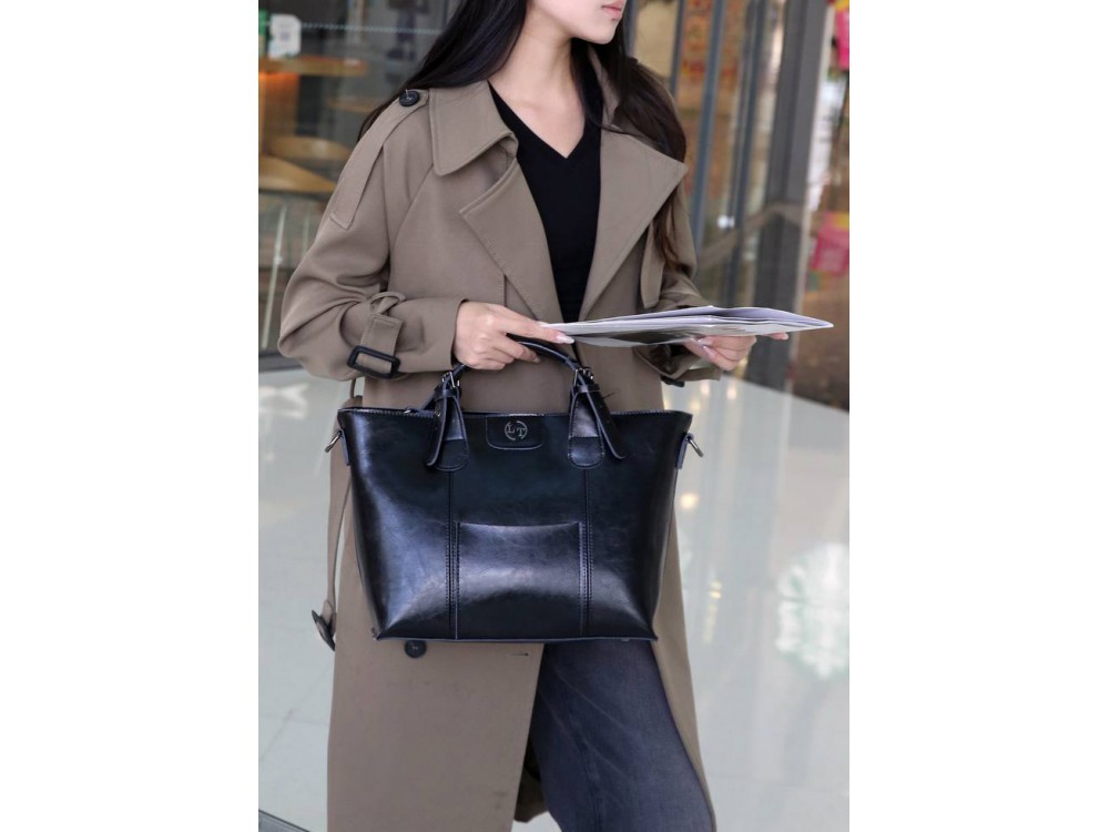 Сумка женская большого размера в классическом деловом стиле с удлиненными ручками на плечо. Сумка застегивается на молнию и имеет три отделения с отдельными входами. При необходимости вмещает формат А... Показать описание4. Ручки имеют отделку металлическими пряжками. На передней стенке расположены два кармана на молнии. На задней стенке также расположен карман на молнии. Сумка на подкладке. Внутри сумки расположены карман на молнии и накладной карман для мобильного телефона и визиток. Размеры 35х24х12 см