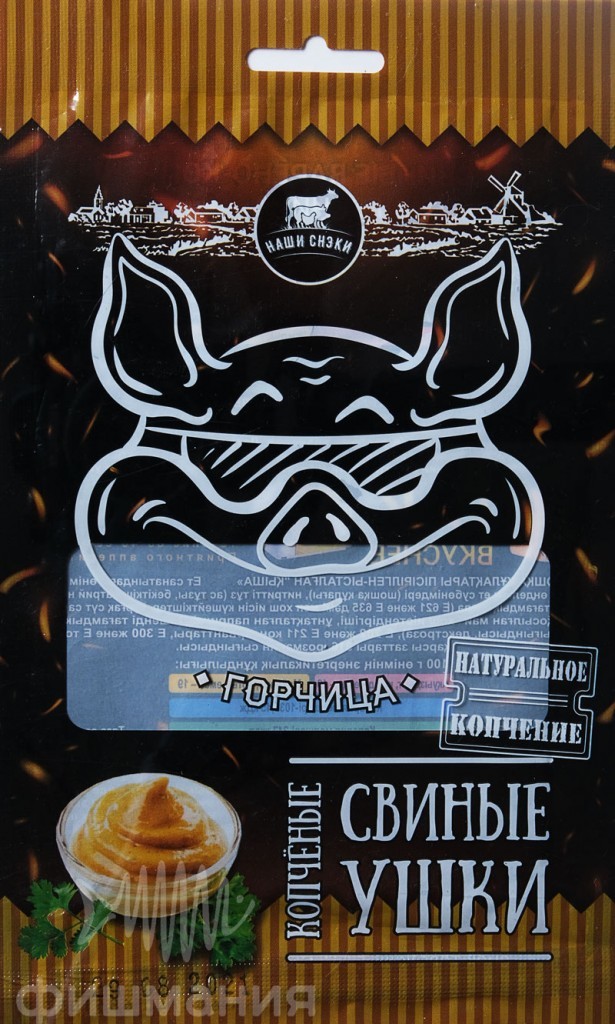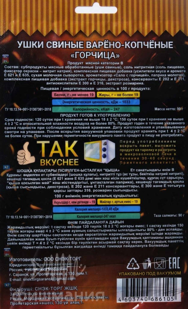 Вес 90 г. Вкус: Горчица Состав: Субпродукты мясные обработанные(уши свиные), соль нитратная (соль пищевая, фиксатор окраски- нитрат натрия), комплексная пищевая добавка ( паприка, чеснок, перец черный... Показать описание, кориандр, орегано, соль, усилитель вкуса и аромата Е 621, сахар) , перец красный молотый острый, консерванты Е 202 и Е 211, антиокислители Е 300 и Е 316, экстракт розмарина Срок годности: 150 суток Условия хранения: при температуре не выше +18С 135 суток, 150 суток, при температуре хранения +4 и относительной влажности 80 % Калории на 100 г в Ккал: 247 Белки, г: не менее 19 Жиры, г: не более 19 Уши свиные варено копченые 100% натуральный продукт. Готов к употреблению не содержит ГМО. ВКУСНЫЙ СОВЕТ: Еще вкуснее в подогретом виде. Перед употреблением вскрыть пакет, выложить продукт на тарелку и подогреть в микроволновой печи 20-30 сек. Ода свиным ушам, найденная в интернете (автор Федор Панарин) Свиные уши – не простой продукт! Вид вызывает изумление... Но кто осмелится их съесть, Тот и познает суть свиных ушей, Тот испытает... НАСЛАЖДЕНИЕ