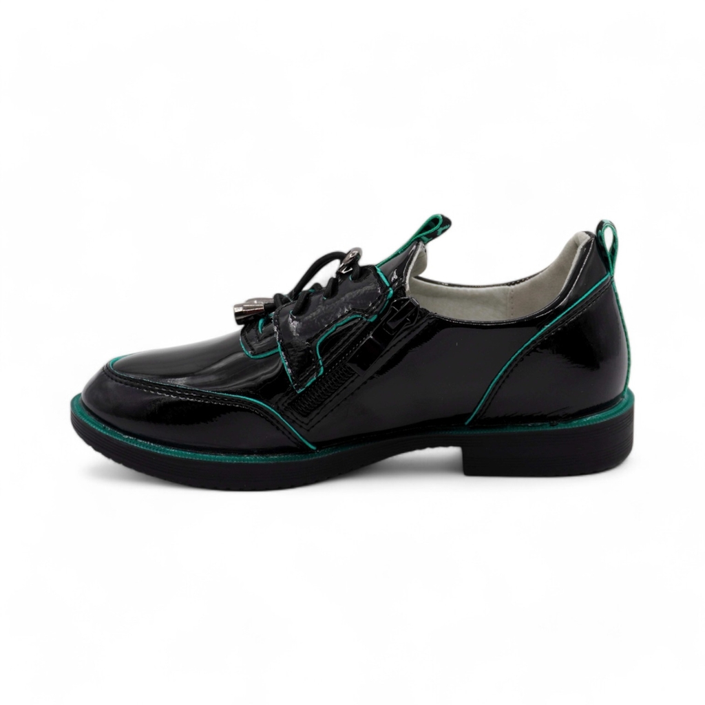 Черные кожаные лоферы подходят для девочки-подростка. Они выполнены из износостойких, гипоаллергенных и дышащих материалов: верх – из натурального велюра, подкладка и стелька – из натуральной гладкой ... Показать описаниекожи. Подошва из ТПУ (термополиуретана) – прочная и амортизирующая. Лоферы украшены массивной пластиковой цепью, а черный цвет и лаконичный дизайн позволяют сочетать их со школьной формой. Модель анатомически правильная: создана с учетом особенностей подростковой стопы.