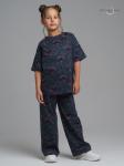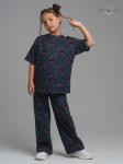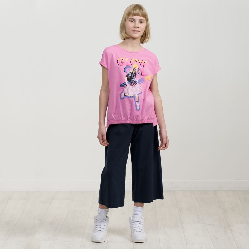 Состав: верх: 100%хлопок, низ: 100%хлопокОписание: Комплект для девочек футболка и кюлоты. Футболка актуального расслабленного силуэта со спущенной линией плеча. Боковые швы переведены на перед, небол... Показать описаниеьшой перепад длин низа изделия. Передняя часть внизу декорирована манжетой из основной ткани с резинкой. Принт в ярких неоновых цветах с градиентом и элементами граффити. Перевод. Сияющая девушка. Брюки кюлоты актуального свободного кроя с имитацией гульфика. Пояс из основной ткани и дополнительной регулировкой шнурком.