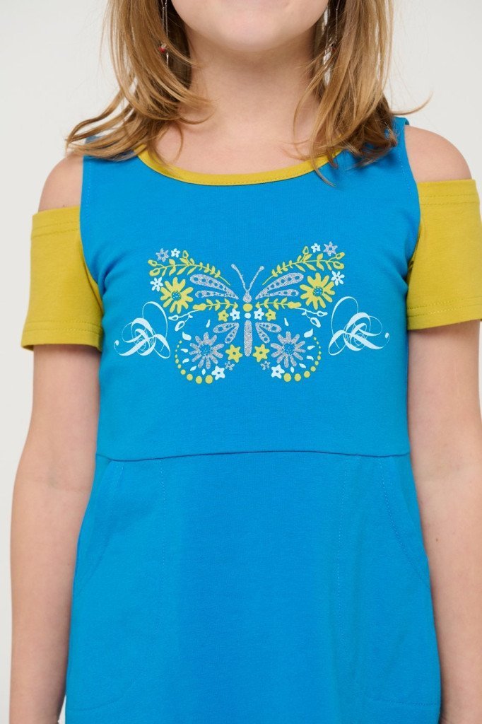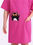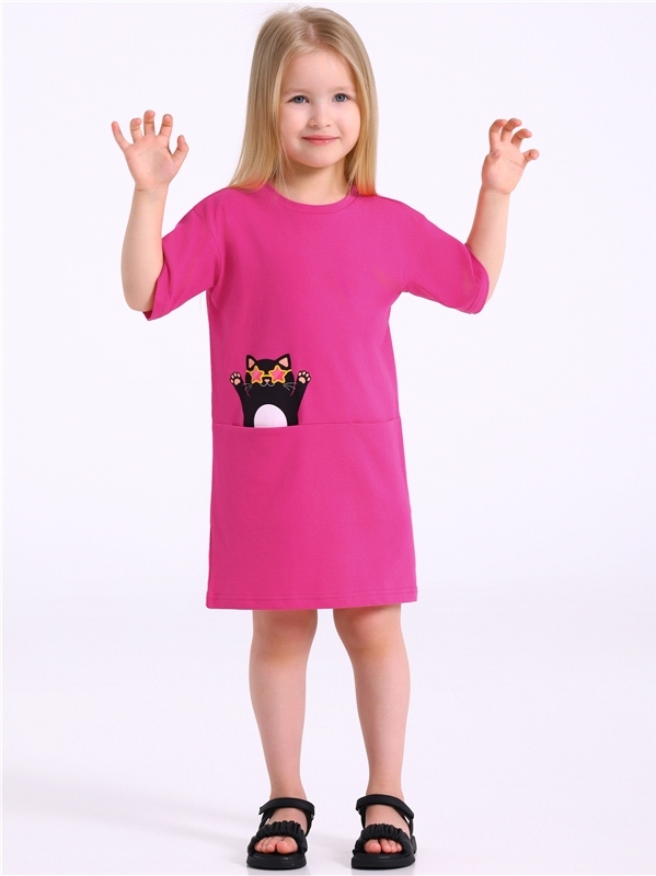 Платье для девочки из кулира - легкого хлопкового полотна. Изделие свободного силуэта, с короткими рукавами со спущенным плечом. Карман "кенгуру" украшен печатью. Уход: только машинная стирка (руками ... Показать описаниене стирать!) при температуре 40 градусов, без предварительного замачивания. Изделия с печатью и декором перед стиркой необходимо вывернуть на изнаночную сторону. Состав: кулир / хлопок 100%.
