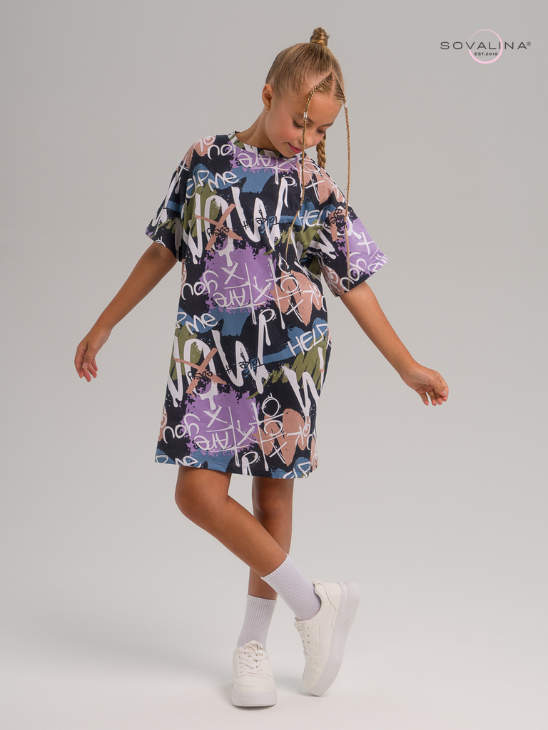 Трикотажное платье-футболка для девушек подростков и совсем юных девочек ТМ SOVAlina. Благодаря натуральному составу из хлопка, этот мягкий материал гарантирует гипоаллегенность и позволяет коже дышат... Показать описаниеь, что особенно важно для детей. Такое легкое и широкое платье удобно не только осенью или зимой в отопительный сезон, но и весной, летом — в любое время года вашему ребенку будет уютно. Прямой фасон оверсайз создает эффектный современный образ и дарит комфорт даже во время длительных мероприятий, а актуальный принт добавит оригинальности. Повседневный яркий наряд будет уместен для любого случая. Идеально подойдет и на выход, и для дома. Свободный широкий крой платья подходит для разных типов фигуры и не стесняет движений. Также, это отличный подарок дочке, внучке или крестнице. Обращаем Ваше внимание, фото выполнено в условиях студийного освещ