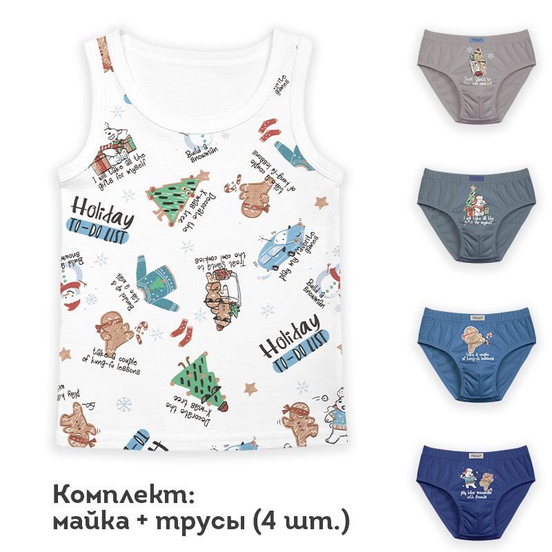 Состав: верх: 100%хлопок, низ: 100%хлопок, низ2: 100%хлопок, низ:3 100%хлопок, низ:4 100%хлопокОписание: Детский комплект белья для мальчика малыша из 100% хлопка с новогодним принтом. В набор входит ... Показать описаниебельевая майка на широких лямках и трусы слипы 4 штуки. Подарите ребенку праздничное настроение и хорошее начало дня. Новогодняя коллекция, яркий цветной набор с принтом с надписями, идеально подойдет для подарка ребенку. Пошив высокого качества, аккуратные швы, которые не доставят дискомфорт ребенку. Трусики и майка идеально впишутся в гардероб мальчика как базовое детское нижнее белье. Удобная и практичная модель майки для детей подходит для повседневной носки дома, как одежда для сна, для занятия спортом, а еще в нем весело готовиться и встречать новый год. Трикотажные детские трусики слипы для подростка с эластичной резинкой по талии надежно держатся на теле, не скручиваются, не закатываются и не сползают, а дышащая ткань позволяет избежать натирания нежной кожи. Лучший новогодний подарок для детей.