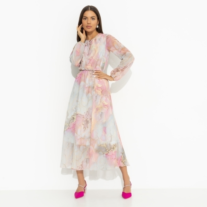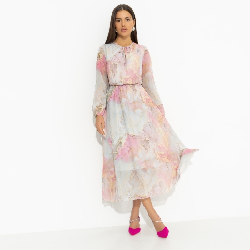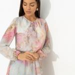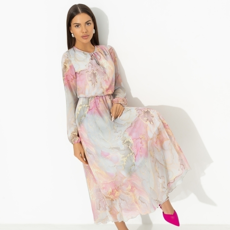 ТН ВЭД: 6204430000. Состав: «Шифон-монако», масло (100% полиэстер). Плотность ткани: Тонкая. Тип ткани: Текстиль. Вид застежки: Завязки. Дополнительный цвет ткани: Разноцветный. Карманы: Нет. Основной... Показать описание цвет ткани: Разноцветный. Отрезная талия: Есть. Подклад: Есть. Резинка по талии: Есть. Рисунок/раппорт: Каждое изделие уникально из-за расположения рисунка на ткани Сезон: Демисезон. Силуэт: Свободный. Стиль: Нарядный. Параметры модели на фото: Грудь: 88 см. Талия: 61 см. Бёдра: 89 см. Рост: 170 см. Размер на модели: 44. Длина изделия: * 44 размер - 122 см. * 46 размер - 122,5 см. * 48 размер - 123 см. * 50 размер - 123,5 см. * 52 размер - 124 см. * 54 размер - 124,5 см. Длина рукава: * 44 размер - 62 см. * 46 размер - 62,5 см. * 48 размер - 63 см. * 50 размер - 63,5 см. * 52 размер - 64 см. * 54 размер - 64,5 см. Обхват груди: * 44 размер - 96 см. * 46 размер - 100 см. * 48 размер - 104 см. * 50 размер - 108 см. * 52 размер - 112 см. * 54 размер - 116 см. Обхват талии: * 44 размер - 88 см. * 46 размер - 92 см. * 48 размер - 96 см. * 50 размер - 100 см. * 52 размер - 104 см. * 54 размер - 108 см. Обхват бёдер: * 44 размер - 120 см. * 46 размер - 124 см. * 48 размер - 128 см. * 50 размер - 132 см. * 52 размер - 136 см. * 54 размер - 140 см. Вес товара, кг: * 44 размер - 0.43. Габариты товара (ДхШхВ), см.: * 44 размер - 32 х 32 х 3. Это не просто наряд, это момент, который хочется продлить... нежность ткани, свобода кроя и моментальное чувство свободы. Настолько стильное, что время теряет свой смысл. Прекрасное мгновение вечности! Платье приталенного силуэта в длине миди. Резинка на талии. Тонкие завязки в зоне декольте. Рукава оформлены тонкими вшитыми резинками. Платье с подкладом. Платье «Летящие мгновения (нежная)» — это не просто элемент гардероба, это воплощение элегантной женственности и стиля, которые создают незабываемые моменты. Каждый раз, надевая это вечернее платье женское, вы ощущаете касание легкого шифона-монако, словно легкий ветерок, обнимающий вашу кожу. Свобода кроя позволяет двигаться с непринужденной грацией, а приталенный силуэт подчеркивает природные изгибы фигуры, создавая образ, который будет уместен и на торжественном вечере, и на романтической встрече. Не упустите возможность купить это платье оптом, ведь его универсальность и утонченный дизайн способны удовлетворить вкусы самых требовательных покупательниц. Благодаря резинке на талии оно подходит для различных типов фигур, включая платье женское больших размеров, а тонкие завязки в зоне декольте добавляют индивидуальности и позволяют регулировать глубину выреза в зависимости от настроения. Рукава оформлены изящными вшитыми резинками, что придает образу нежную игривость и легкость. Подкладка обеспечивает комфорт и уверенность в каждом движении, делая это платье идеальным выбором для любого сезона. Подробное описание: 431764893