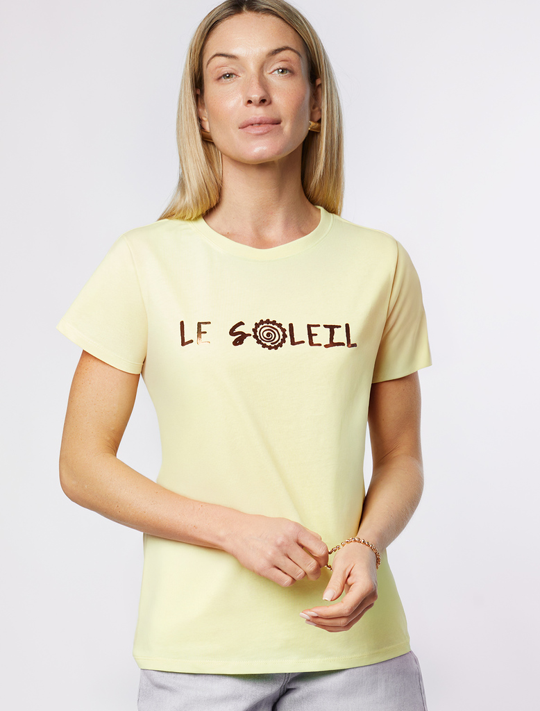 Состав: 100%Хлопок Плотность: 140 Г/м2 Перевод принта: "le soleil (фр.) - солнце". Футболка прямого кроя выполнена из 100% хлопка. Базовая модель дополнена лаконичным авторским принтом. Легко впишется... Показать описание в повседневный гардероб. Изделие хорошо держит форму и обеспечивает комфортный микроклимат в течение дня.