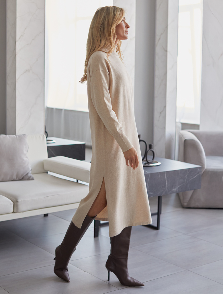 Состав: 82%Хлопок 18%ПА Плотность: 12 GG Параметры модели на первом фото: Рост 172, бюст 88, талия 64, бедра 88 Размер товара на первом фото: 42 Платье тонкой вязки выполнено из хлопка. Лаконичная мод... Показать описаниеель с высоким воротом дополнена манжетами и разрезами по бокам. Изделие свободно сидит по фигуре и не сковывает движений. Мягкая пряжа очень приятная к телу не колется и сохраняет тепло при этом не перегревая. Изделие дополнено металлическим логотипом бренда.
