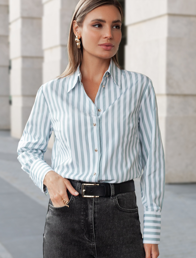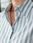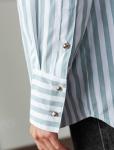 Состав: 65%Хлопок 35%ПЭ Плотность: 100 Г/м2 Параметры модели на первом фото: Рост 170, бюст 89, талия 63, бедра 92 Блузка свободного силуэта выполнена из смесовой струящейся ткани. Модель в вертикальн... Показать описаниеую полоску дополнена золотистыми рельефными пуговицами. Свободный силуэт подходит для любой фигуры. Для идеального роскошного образа используйте в качестве низа брюки светлых тонов. На спинке изделия фирменный металлический логотип бренда.