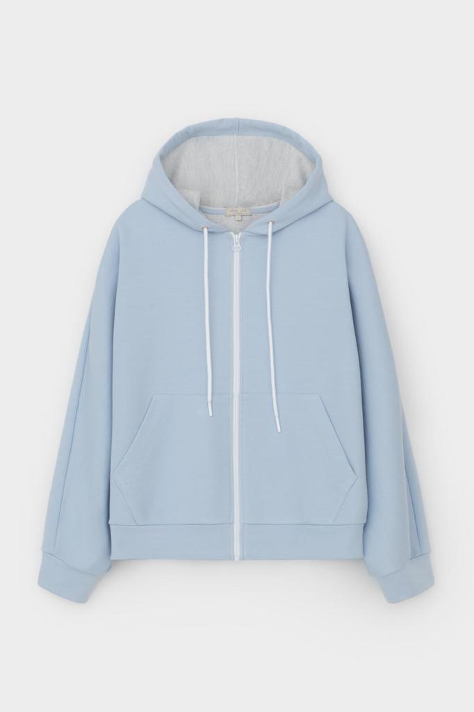 Объемная толстовка из двухцветного трикотажного футера. Внутренняя сторона изделия представлена в натуральном цвете хлопка, внешняя в нежно-голубом. За счет использования крашенной пряжи данный вид по... Показать описаниелотна прошел минимальную обработку, что придало изделию мягкость и шелковистость.