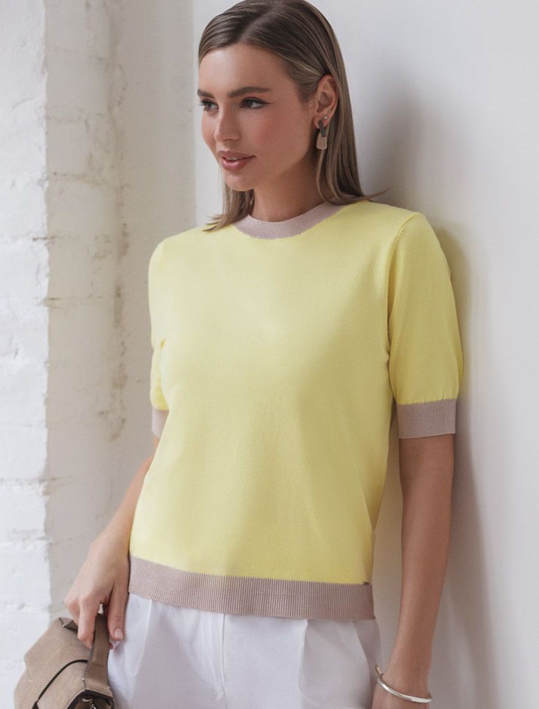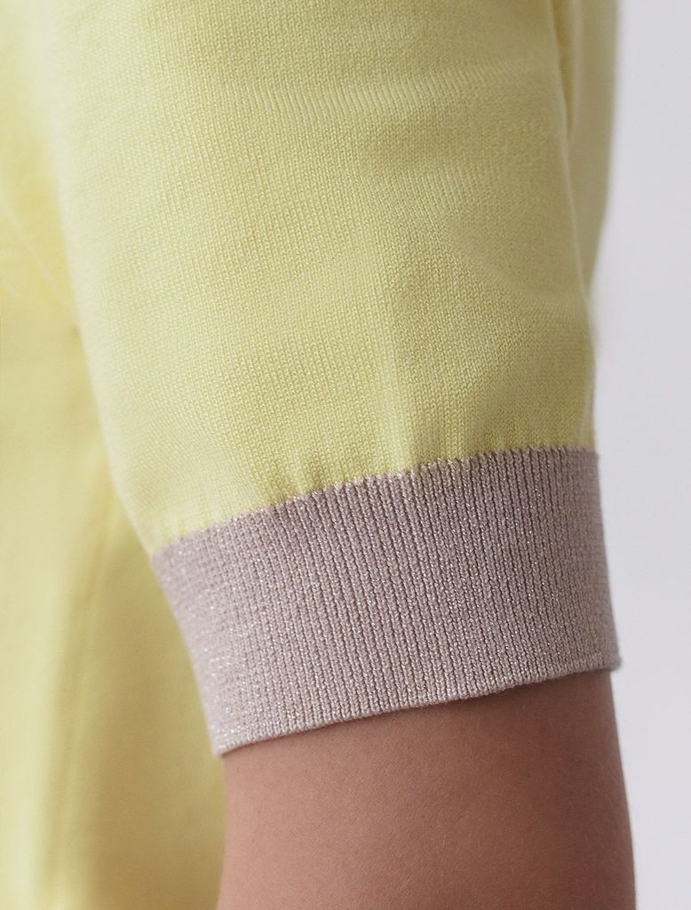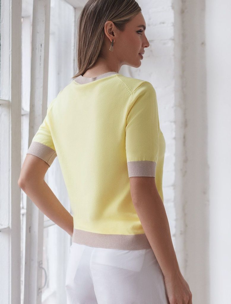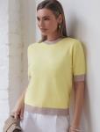 Состав: 80%Вис 20%ПА Легкий джемпер лимонного цвета с круглым вырезом идеально подходит на весну и лето. Тонкая вязка из вискозы дарит приятный комфорт и ощущение свежести в теплую погоду. Полуприлега... Показать описаниеющий крой подчеркивает силуэт, а универсальная длина позволяет сочетать джемпер с разными элементами гардероба. Контрастная отделка с мягким люрексом добавляет стильный акцент, создавая выразительный образ. Деликатное мерцание придает праздничное настроение, но не выглядит слишком ярко или вызывающе. Такой элемент украшения позволяет носить нарядный джемпер и на особых мероприятиях. Джемпер отлично смотрится на больших размерах благодаря продуманному крою и полуприлегающему фасону. Этот джемпер с коротким рукавом станет незаменимой частью гардероба в сезоны, когда хочется легкости и элегантности одновременно. Лаконичный дизайн обеспечивает простоту комбинирования с другими вещами и будет универсальной базой для создания разнообразных комплектов — от офисного до непринужденного городского стиля.