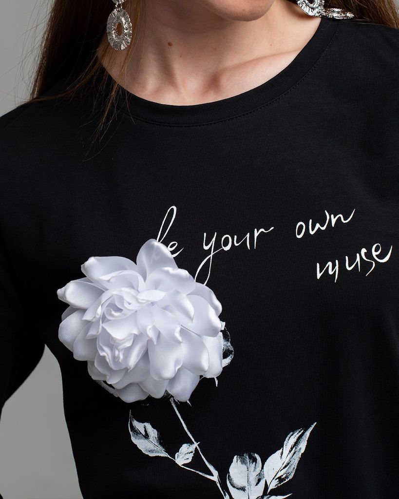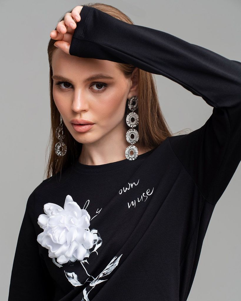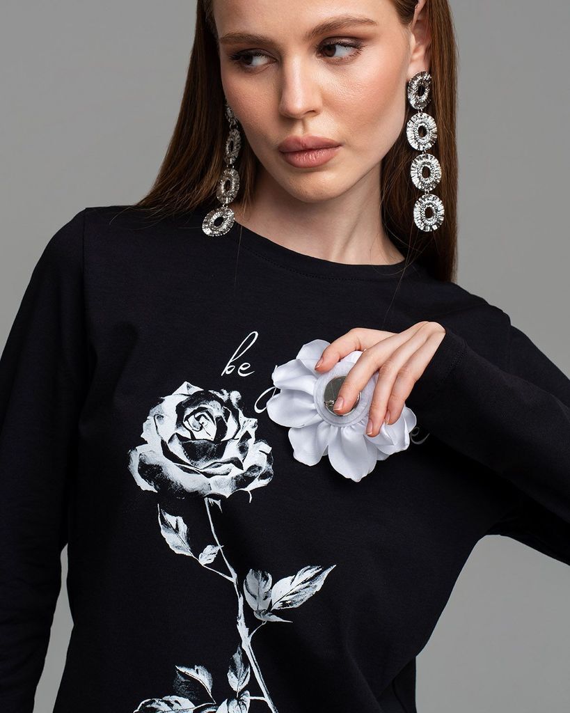 Описание Базовый лонгслив с принтом и цветком брошью— легкая модель для создания расслабленных спокойных образов. Сделан он из приятной для тела хлопковой кулирки. Это ткань, которая дышит, гипоаллерг... Показать описаниеенна и не вызывает раздражений. Мягкая и эластичная кулирка хорошо переносит стирки и служит долго. Поэтому можете быть уверены, что изделие с вами на несколько сезонов. Поставщиком ткани для нас является Турция. В базовых вещах особенно важно удобство в мельчайших деталях. Мы уделяем внимание каждому шву, чтобы вы носили изделия с удовольствием и пониманием, что они выглядят идеально не только с лицевой стороны, но и с изнаночной, а ещё не натирают и не создают дискомфорт. Наше производство находится в России. Дизайн разрабатывается в творческой мастерской Sahar. Это означает, что мы не занимаемся перепродажей вещей из других стран, переклеив логотип. Sahar — это оригинальный дизайн и авторский почерк создателя бренда. Состав: 95% хлопок, 5% лайкра.
