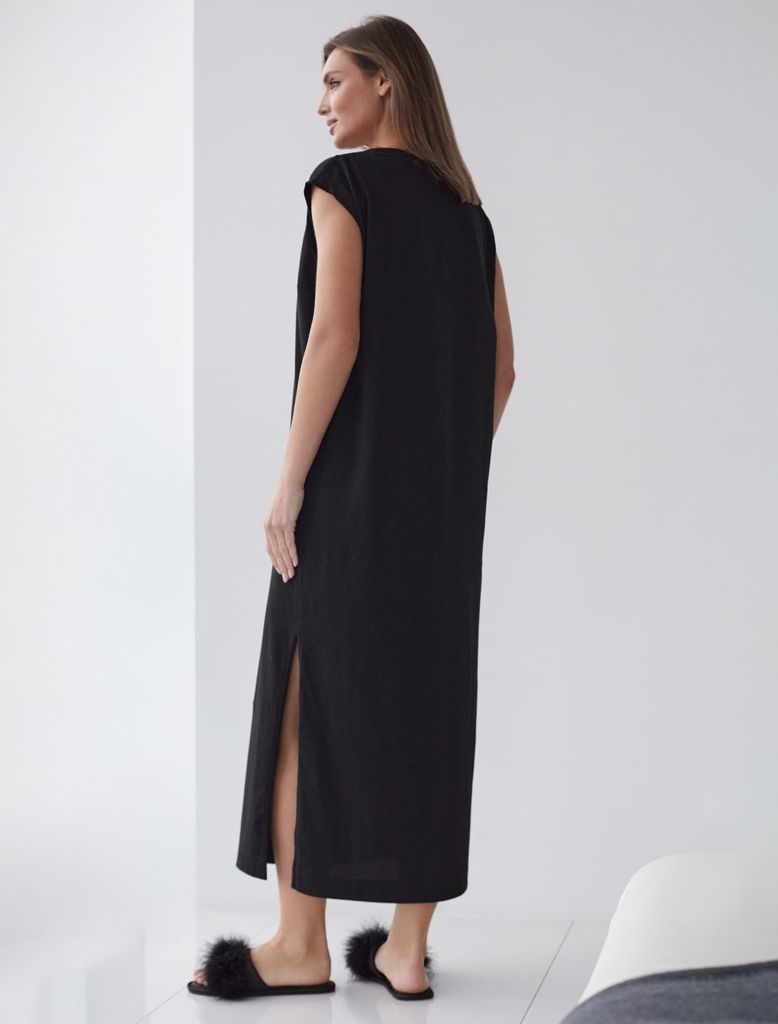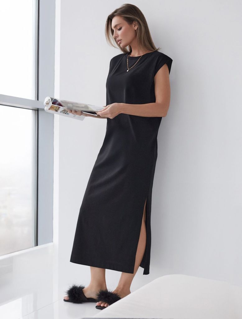 Состав: 100%Хлопок Плотность: 140 Г/м2 Стильное базовое платье черного цвета длины макси идеально для весны и лета. Легкое и дышащее, оно выполнено из натурального 100% хлопка, что обеспечивает комфор... Показать описаниетное ношение в теплое время года. Свободный и прямой крой не сковывает движений и легко скроет возможные недостатки фигуры. Благодаря разрезам платье добавляет легкости и непринужденности образу, делая его подходящим для повседневных и непринужденных мероприятий. Короткий цельнокроеный рукав и позволяет чувствовать себя удобно в теплую погоду, а так же в домашней обстановке. Простота кроя сочетается с современным дизайном, создавая гармоничный лук без излишеств. Это легкое платье подойдет для тех, кто ценит комфорт и элегантность одновременно.