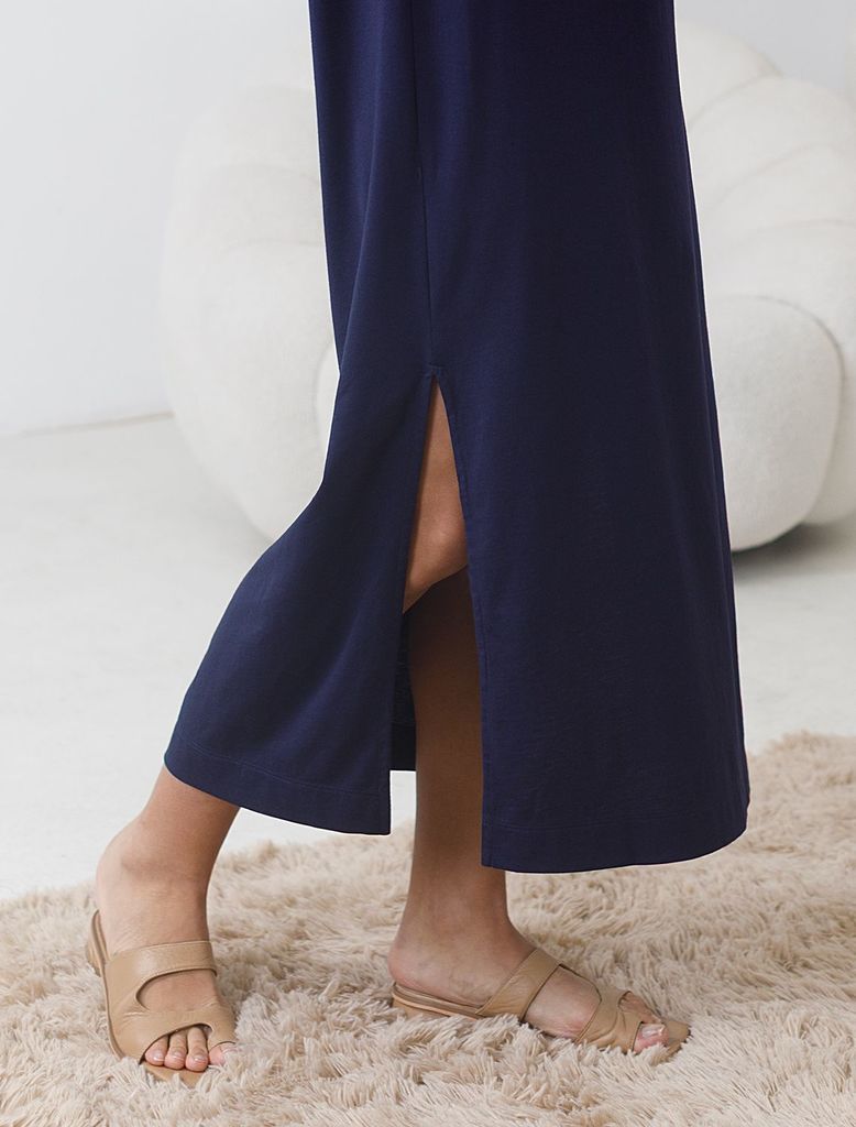 Описание Сорочка ночная из хлопкового трикотажного полотна с добавлением модала, слегка расклешенная книзу. Узкая бретель с регулировкой длины. V-образный вырез горловины с внутренней обтачкой.