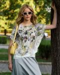 Описание Футболка "Кимоно-баллон" из вискозной ткани "Венеция" с полной запечаткой авторским принтом. Это тонкий плотный трикотаж с матовой поверхностью, мягкий и шелковистый на ощупь, не образует кат... Показать описаниеышков. Защипы чуть ниже талии позволяют скрыть проблемные зоны фигуры. Принт наносится таким образом, что краска введена в саму текстуру ткани и надежно там закреплена. Трикотаж остается эластичным, нет никаких слоев нанесения сверху ткани. Благодаря такой технологии рисунок остается ярким даже после многочисленных стирок. Состав: 70% вискоза, 25% полиэстер, 5% лайкра.